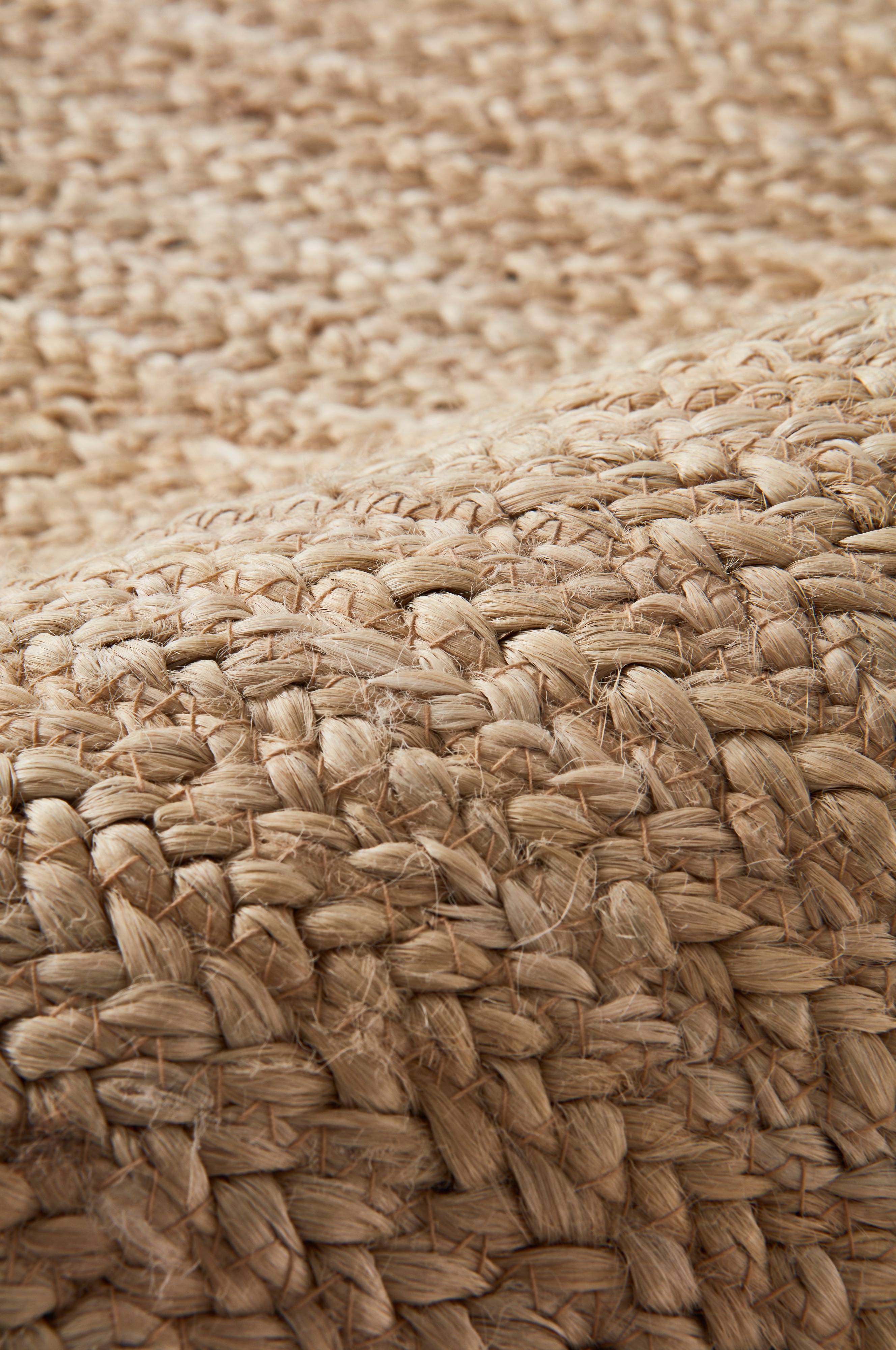 Håndvevd teppe av jute som innfarget i jordnære farger. Teppet er ensfarget med naturlig melering. Jute er et rustikt naturmateriale. Et håndlaget teppe er et fint håndverk, og hvert teppe er unikt. Det lange, smale teppet gjør seg ofte fint i en gang eller på et vaskerom. Tykkelse 0,7 cm. 2100 g/m².