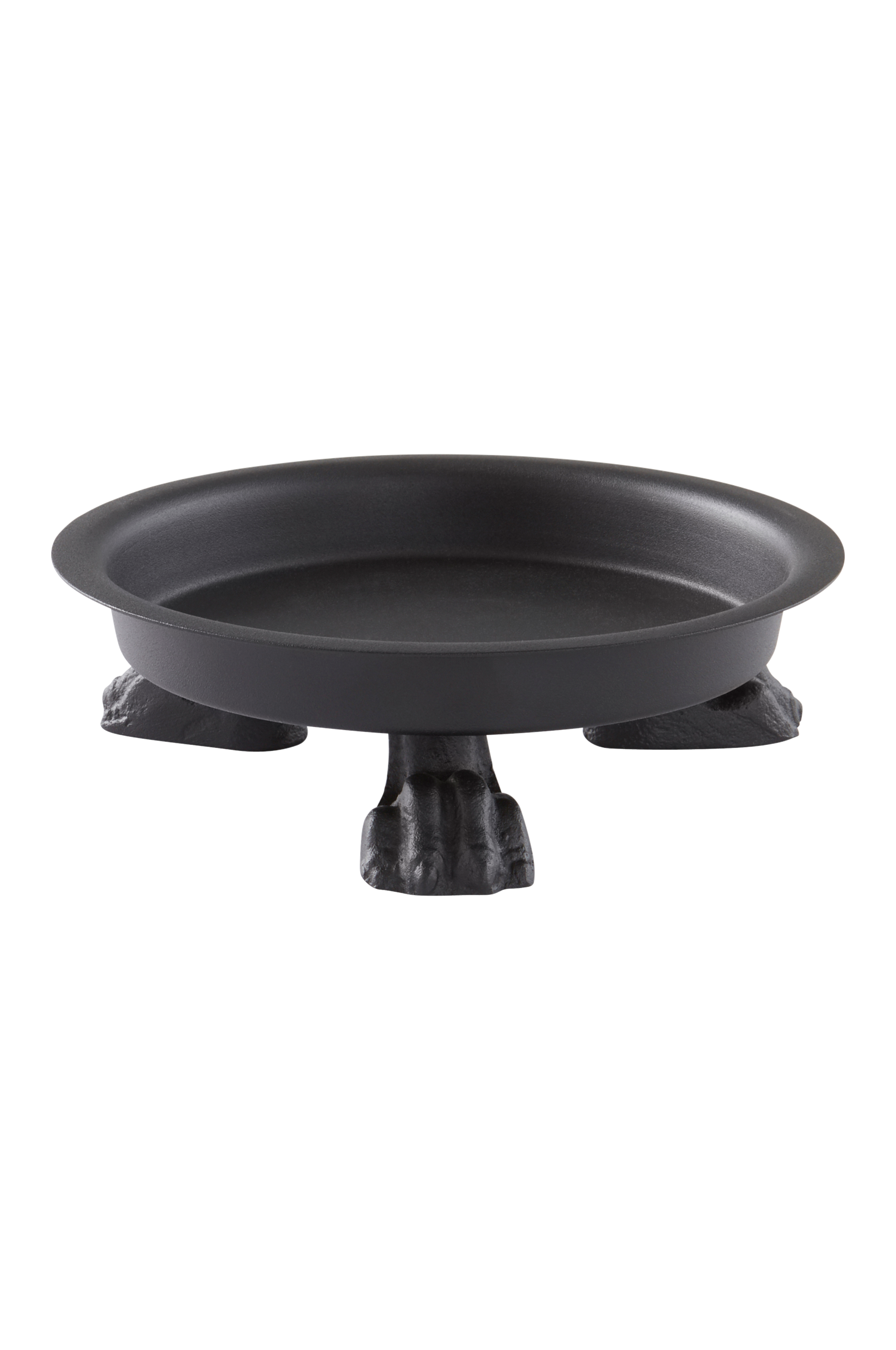 Potteskål / krukkefat av jern med matt overflate. De tre bena er av støpejern slik at skålen står stabilt med bena på jorden. Skålen passer perfekt til en pen, matchende blomsterpotte.