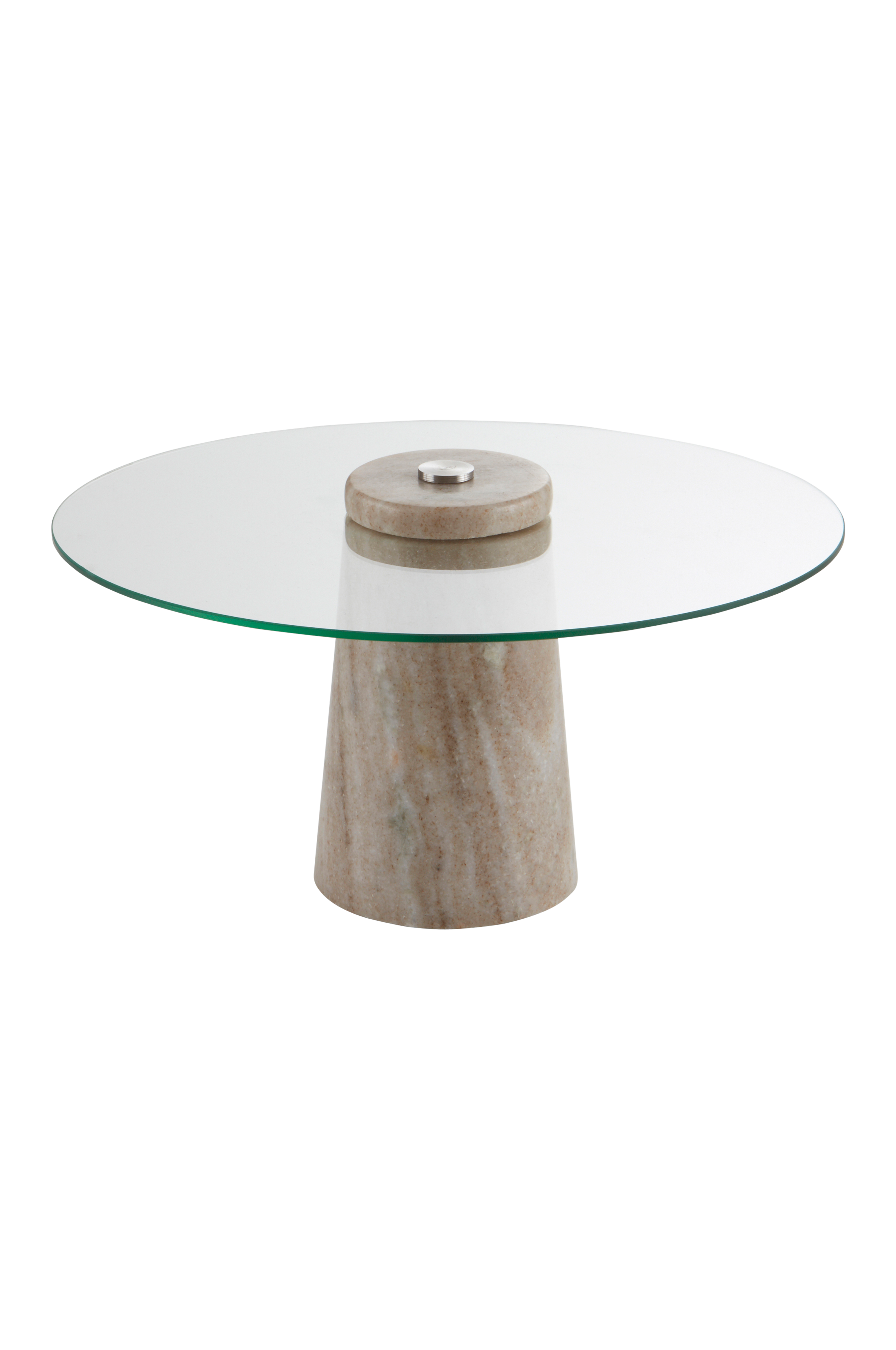 Rundt serveringsfat av glass på stett av marmor. Serveringsfatet presenterer småkaker like fint som appetittvekkere og snacks. Marmor er en naturstein, og mønsteret varierer alltid litt avhengig av bergartens sammensetning. Dette gjør hvert objekt unikt.
