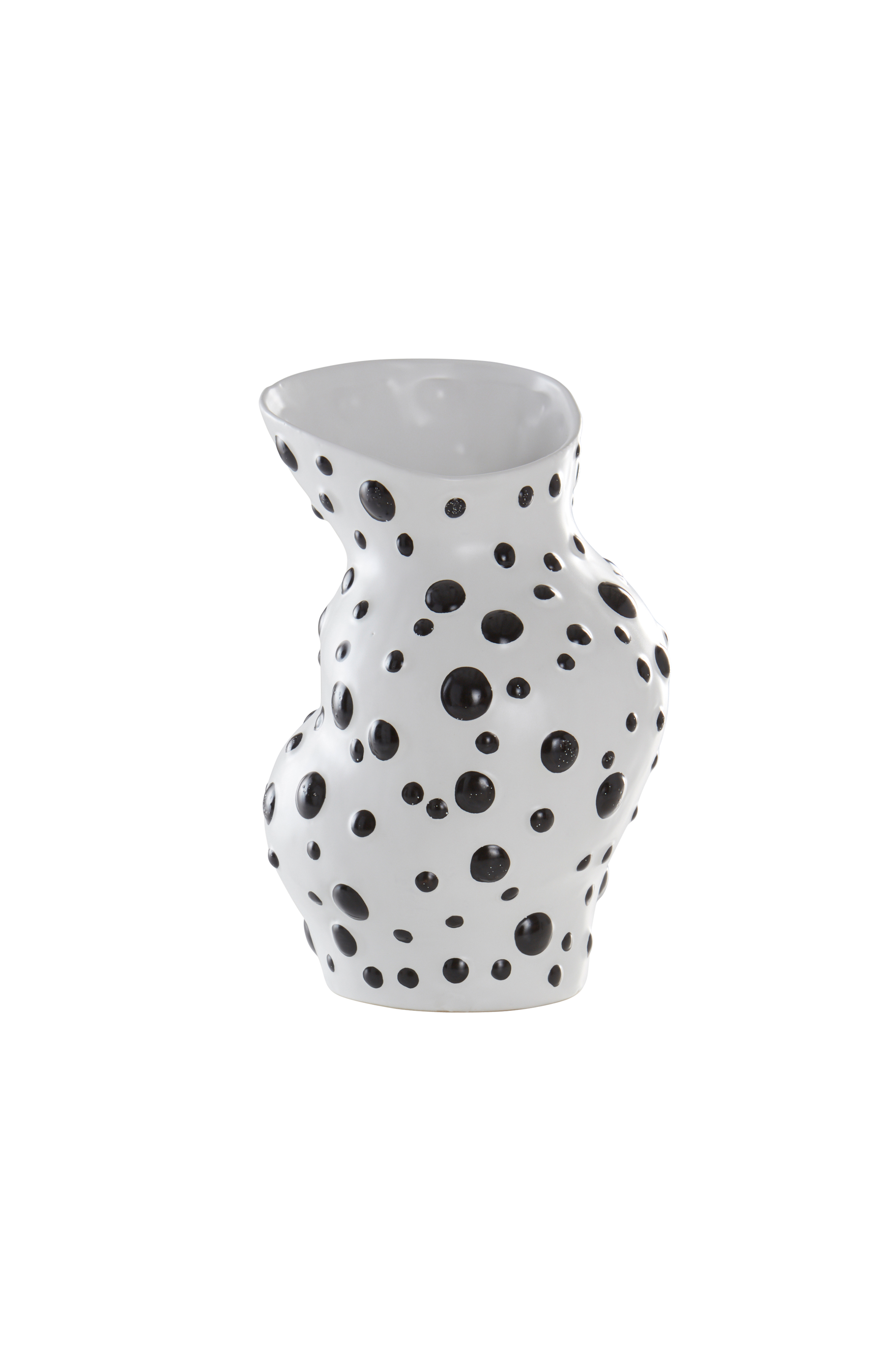 Dekorvase av keramikk. Vasen er håndlaget med en uregelmessig fasong og et dekorativt prikkete mønster. Innsiden er også glasert. Et visst avvik kan forekomme ettersom vasen er håndlaget. Keramikk kan slippe gjennom fukt.