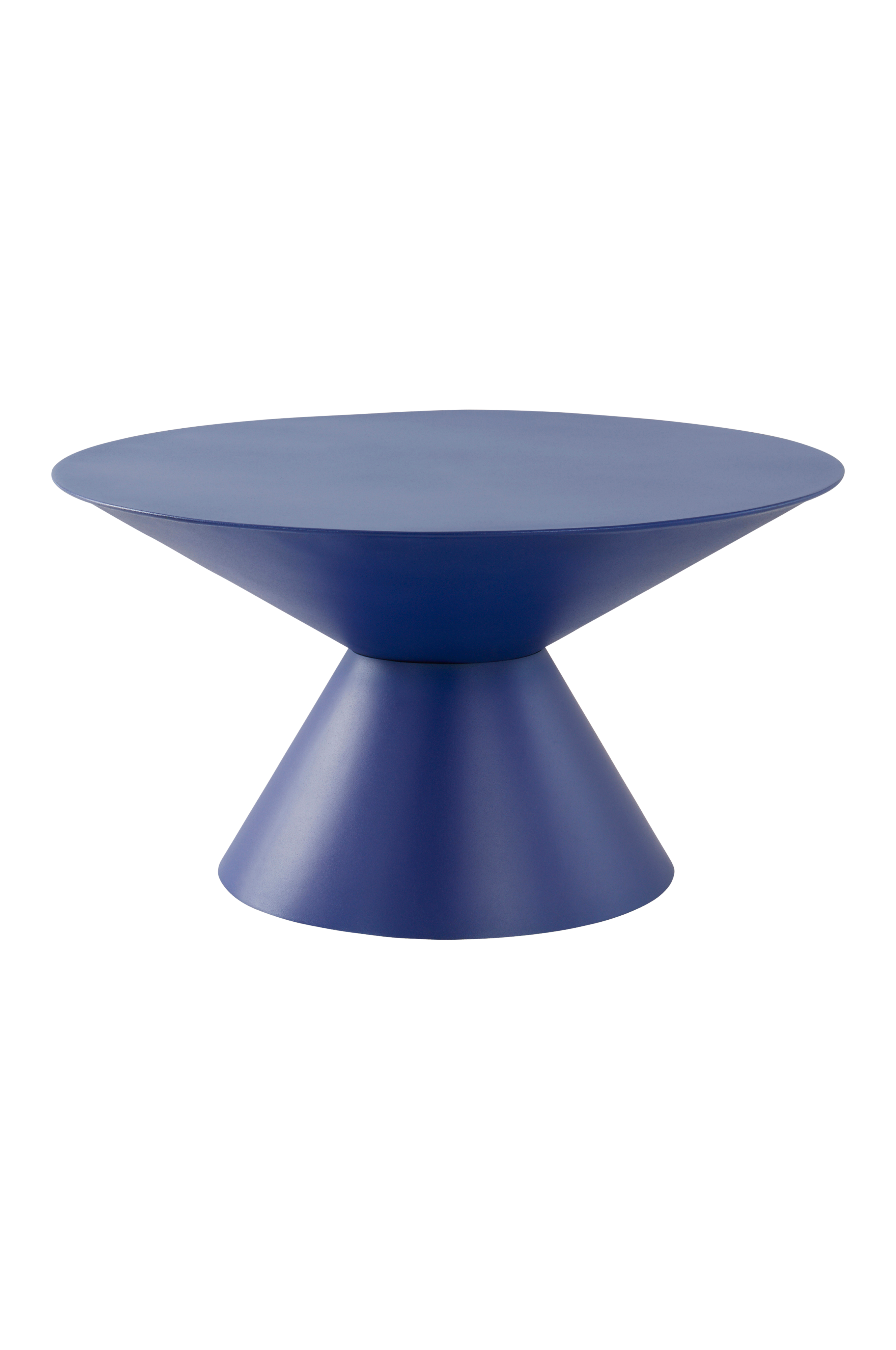 Rundt sofabord av jern i oppkvikkende form som skiller seg ut. Bordet består av to kjegler som møtes på et avsmalnende midtparti. Den malte overflaten er malt og har lett tekstur.