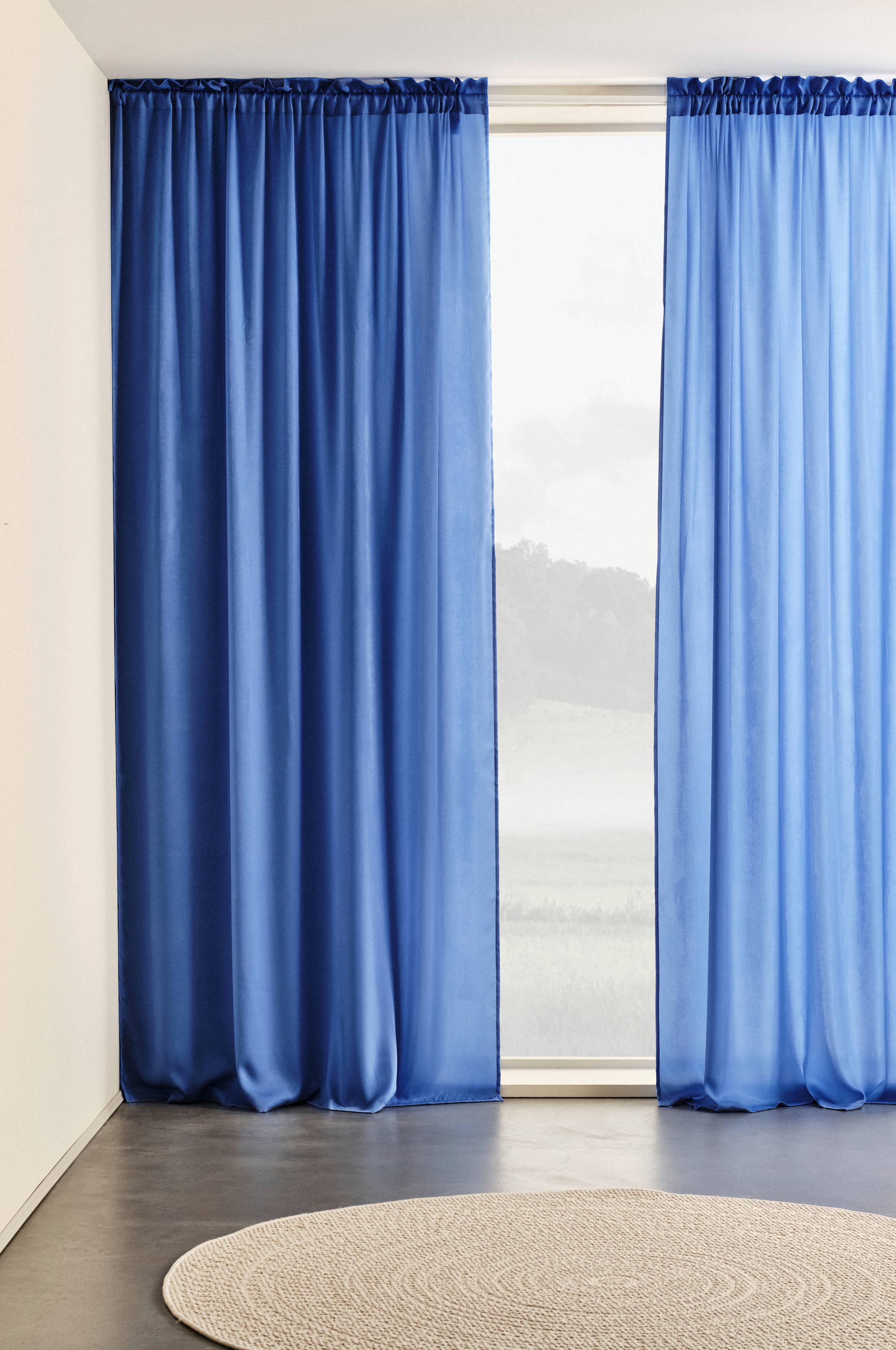 To gardiner med kanal av ensfarget polyester i en myk kvalitet med fint fall og flott glans. Sidene har overlocksøm som forsterker lengdenes smidighet og fine fall. Hver lengde har 5 cm kanal og 5 cm rynkehode.