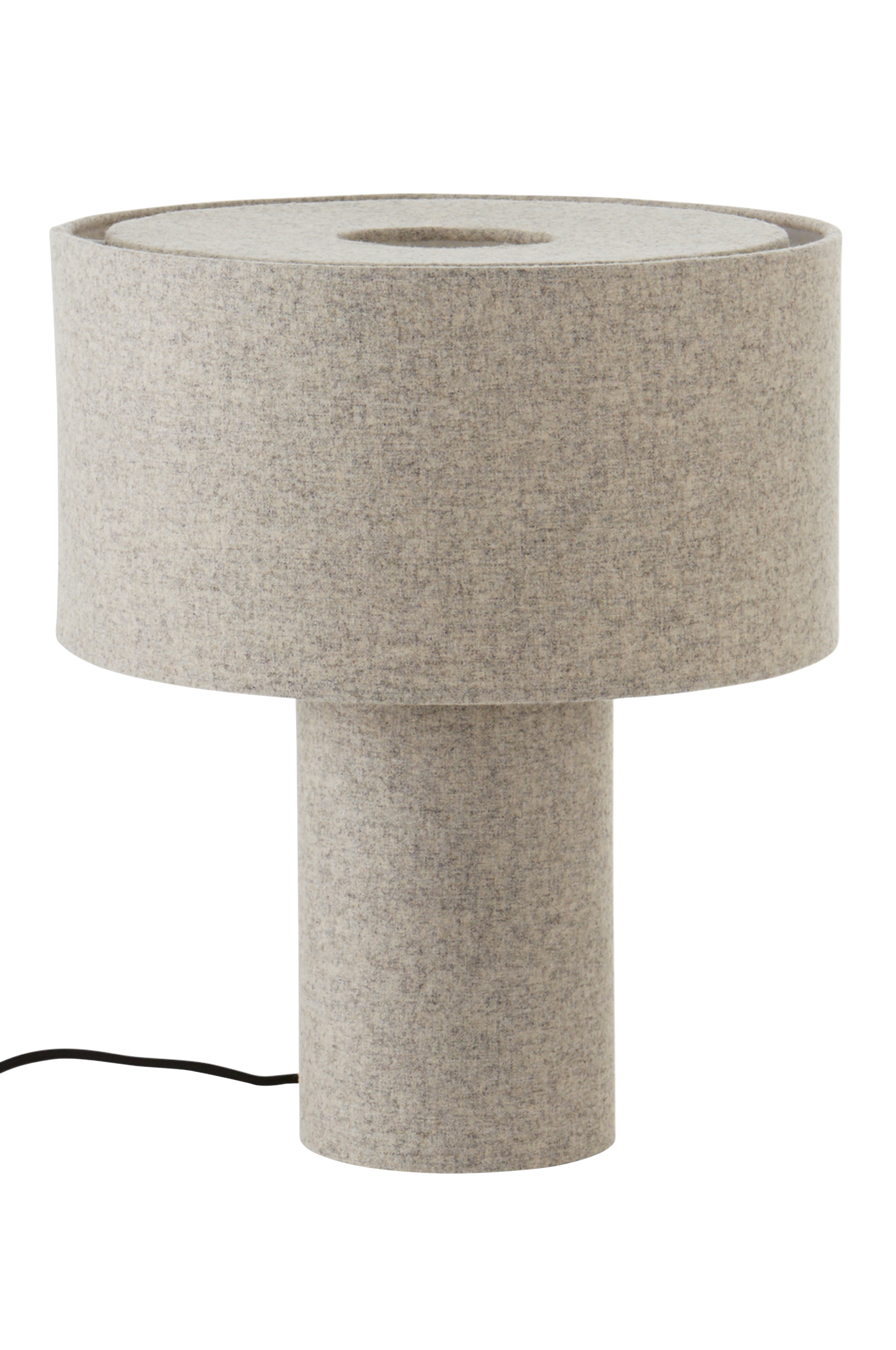 Bordlampe av myk filt i en naturnær nyanse. Svart tekstilkledd ledning.