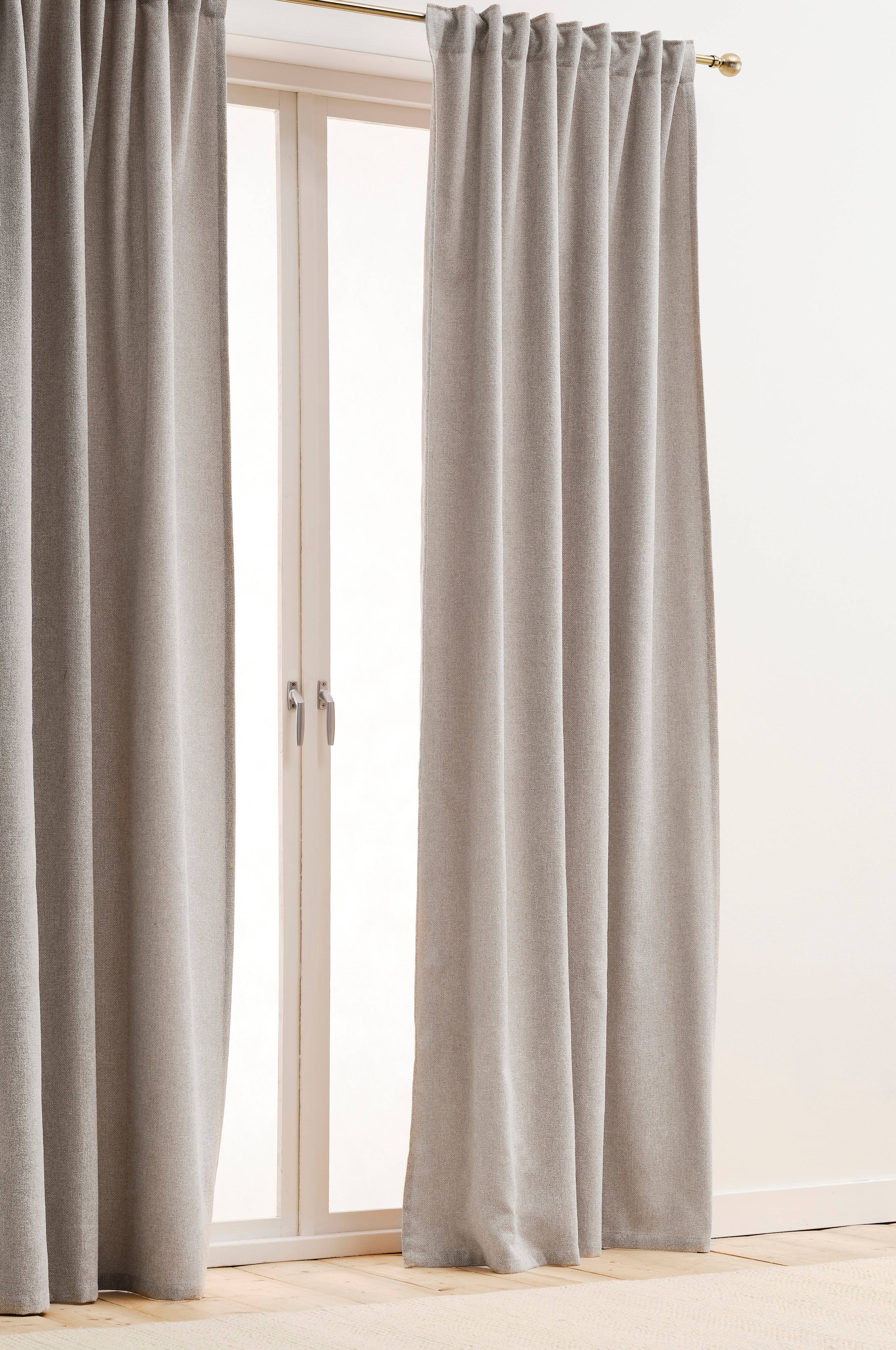 2-pk ensfargede gardinlengder med fin struktur og litt grovt stoff. Gardinen har påsydd multifunksjonsbånd og kan henges opp med fingerkroker, kanal samt skjult hempe.