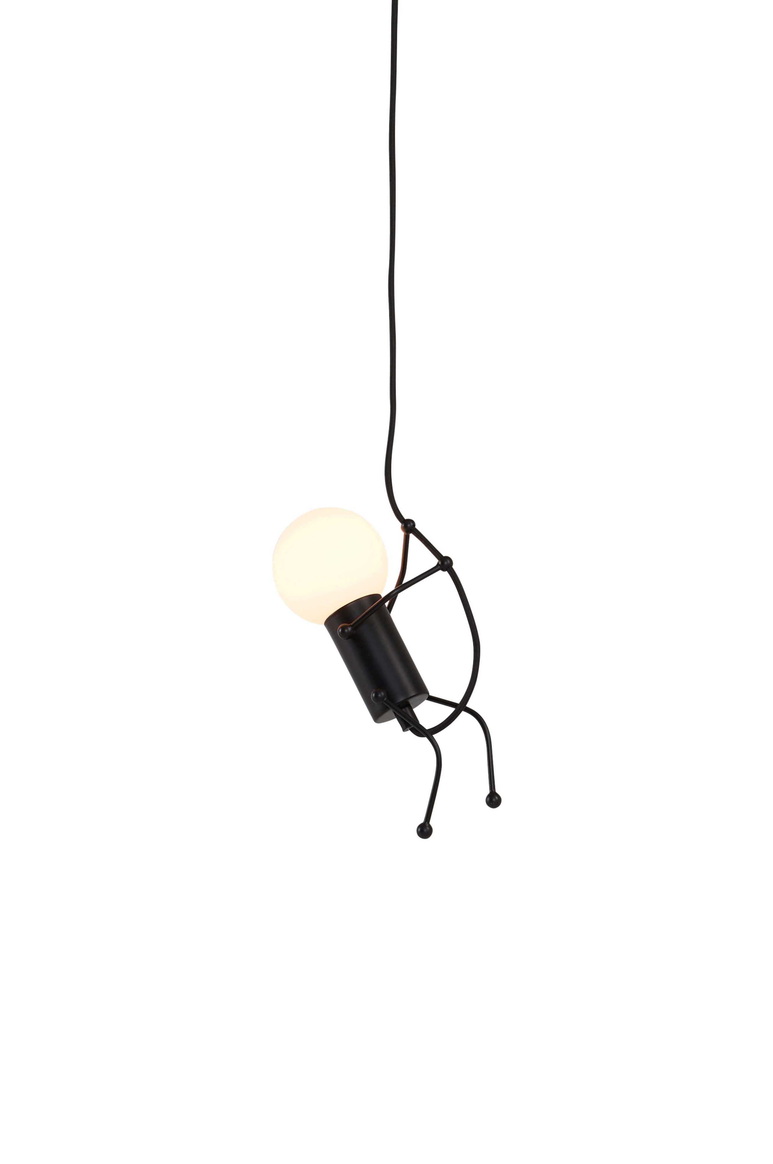 Fin lampe i metall. En svart fantasifigur klatrer opp på den svarte tekstilledningen. Lyskilden kan forandre lampen avhengig av hvilken pære du velger. Ledningslengde 3,5 m.