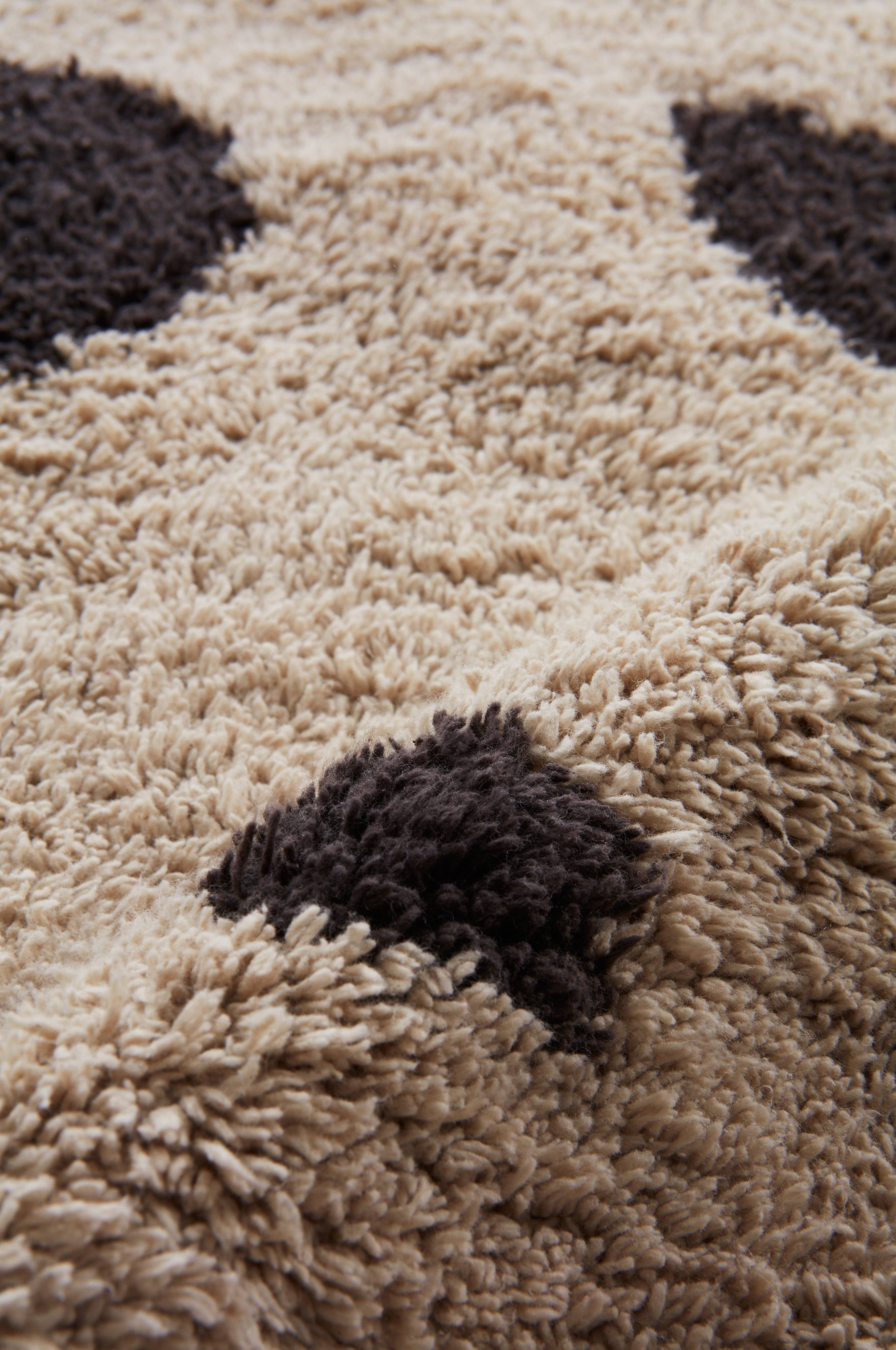 Rundt, mønstrete teppe av bomull med kort, myk lugg. Det dråpeformede og uregelmessige mønsteret gir et livlig teppe som fanger oppmerksomheten. Et mykt og deilig bomullsteppe passer like fint i stua som på soverommet. Lugghøyde 1 cm. Tykkelse 1,1 cm. 1500 g/m².