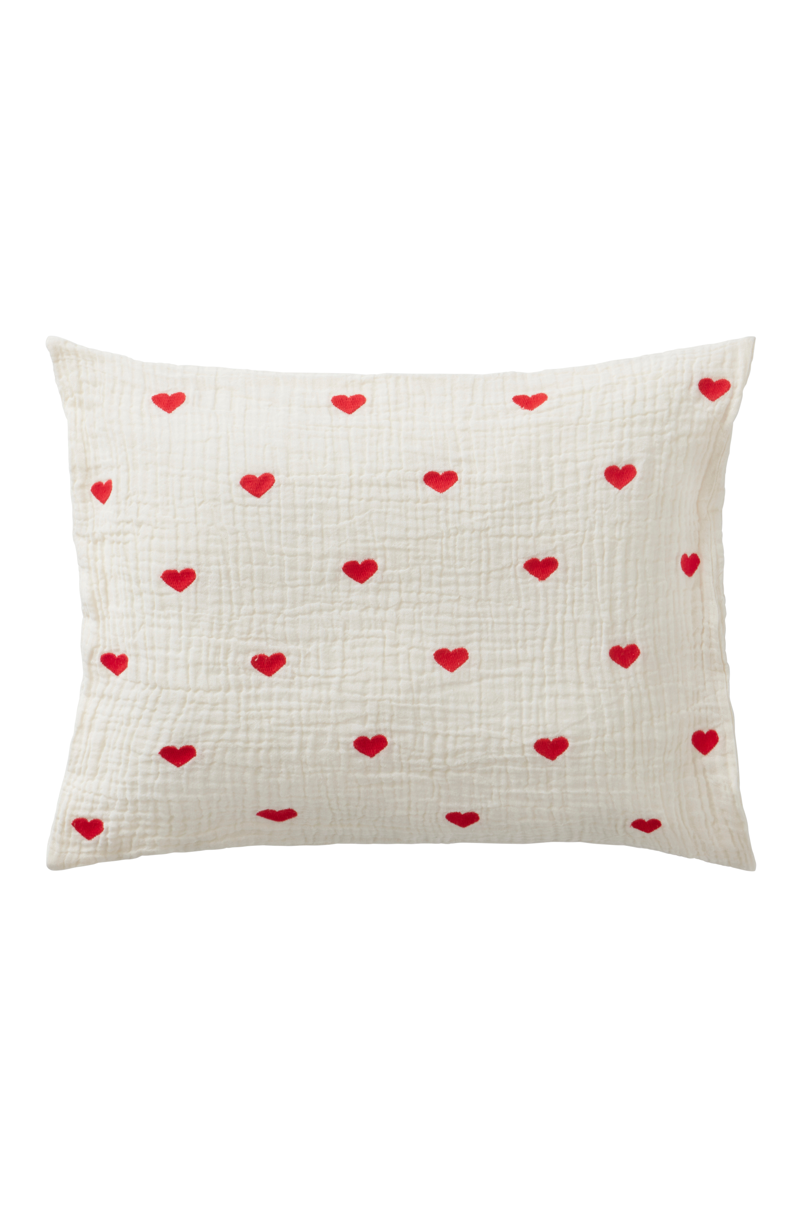 1-pk putevar i herlig, økologisk bomullsmusselin med broderte hjerter. Musselin er et mykt, tynt stoff i to lag, vevd med litt boblete effekt, noe som gjør stoffet mykt og ekstra lettstelt. Du trenger hverken stryke eller mangle. Det behagelige musselinstoffet er deilig å sove i. Dette lille putevaret beskytter lakenet. Det er enkelt å skifte jevnlig i barnevognen eller vuggen slik at du kan vaske det ofte. Baksiden er ensfarget. Trådtetthet på 178 tc. (Trådtettheten forteller om antallet tråder, thread counts, pr. kvadrattomme i et stoff. Jo høyere trådtetthet, desto høyere kvalitet.)