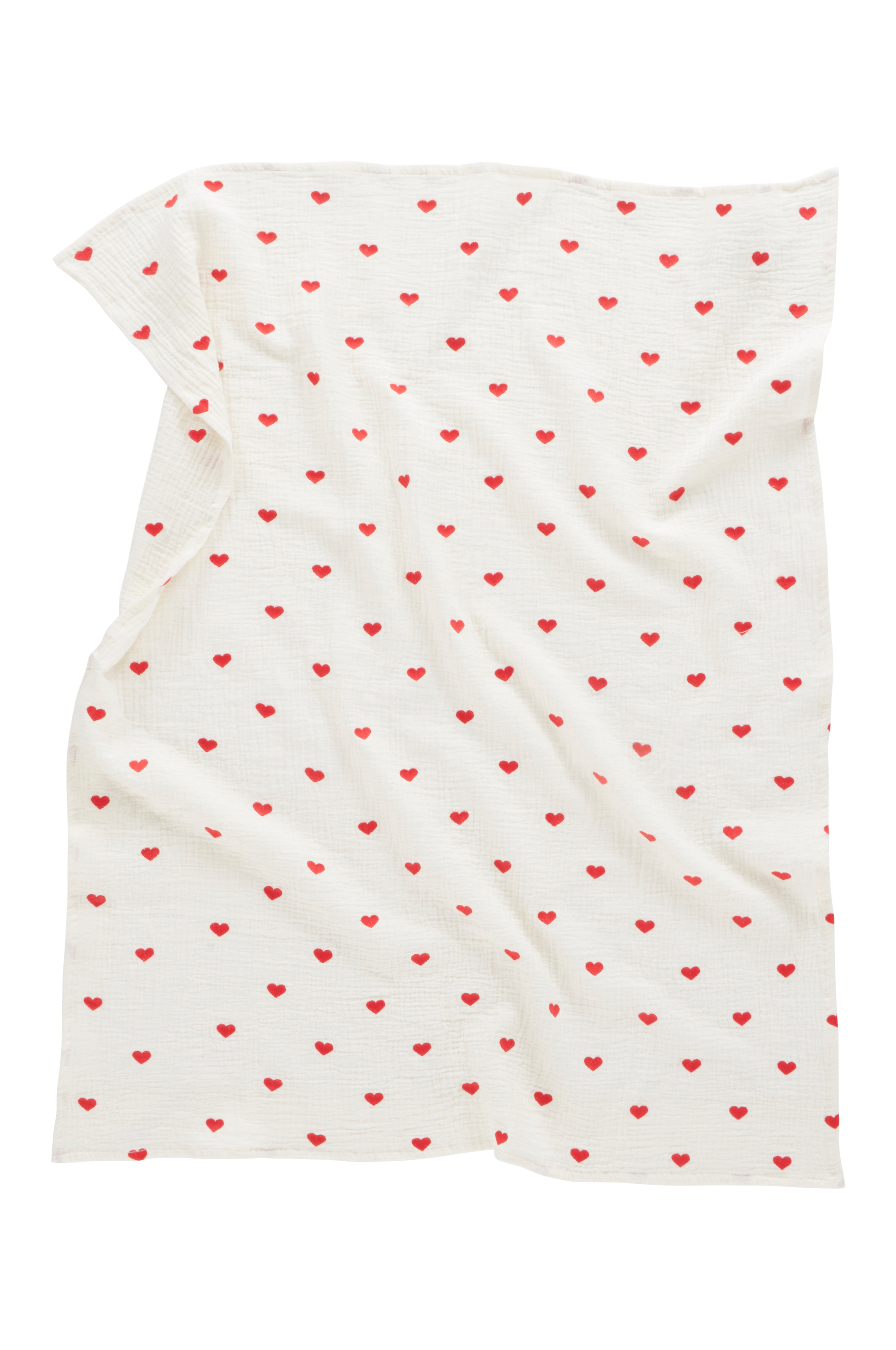 Babyteppe i herlig, økologisk bomullsmusselin med broderte hjerter. Musselin er et mykt, tynt stoff i to lag, vevd med litt boblete effekt, noe som gjør stoffet mykt og ekstra lettstelt. Du trenger hverken stryke eller mangle. Det behagelige musselinstoffet er deilig å sove i. Den ene siden har hjerter og den andre siden er ensfarget. Trådtetthet på 178 tc. (Trådtettheten forteller om antallet tråder, thread counts, pr. kvadrattomme i et stoff. Jo høyere trådtetthet, desto høyere kvalitet.)