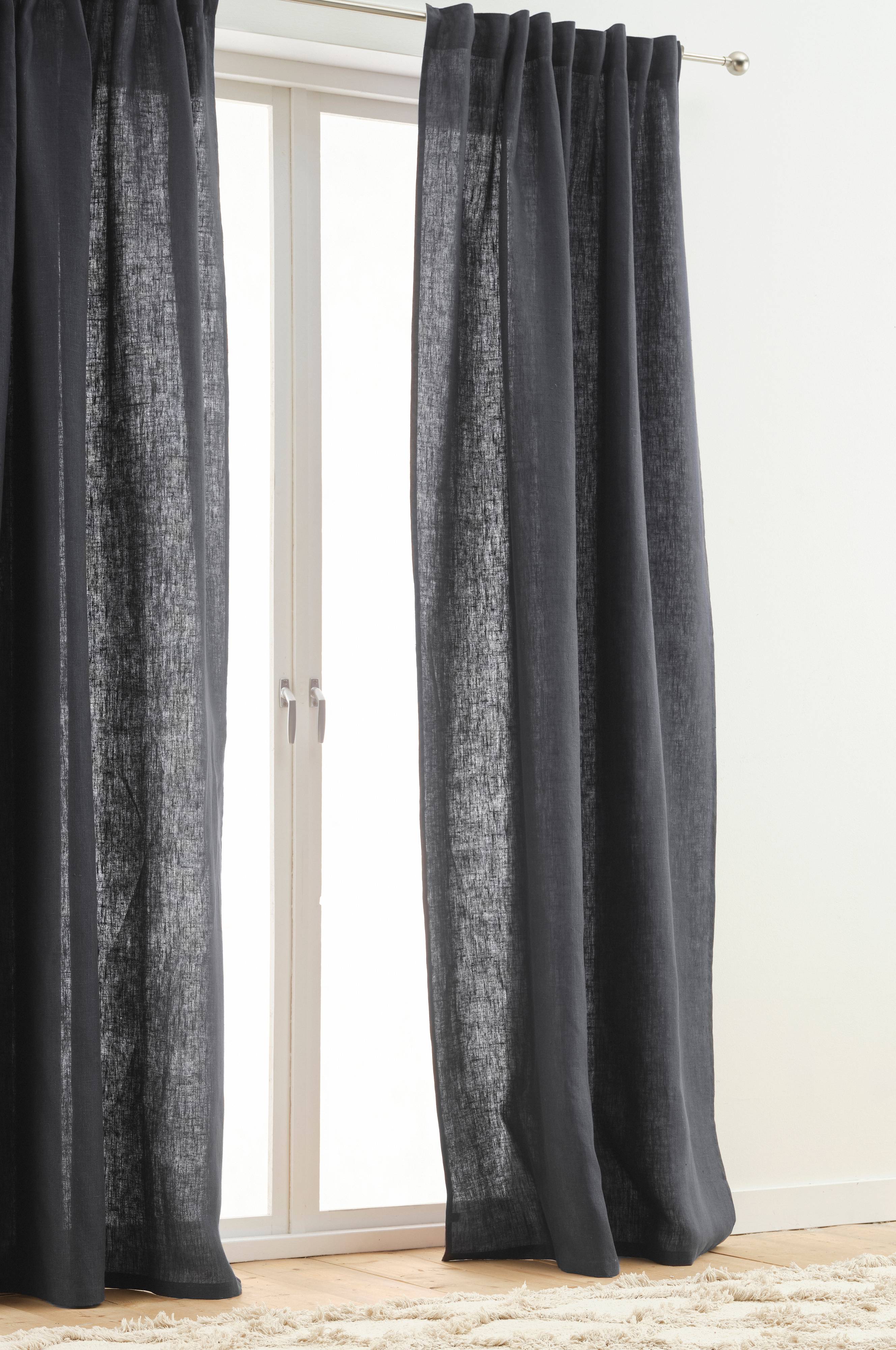 To ensfargede gardinlengder i herlig lin med fin tekstur som gir en eksklusiv følelse. Med påsydd multifunksjonsbånd. Gardinen kan henges opp med fingerkroker, kanal samt skjult hempe.
