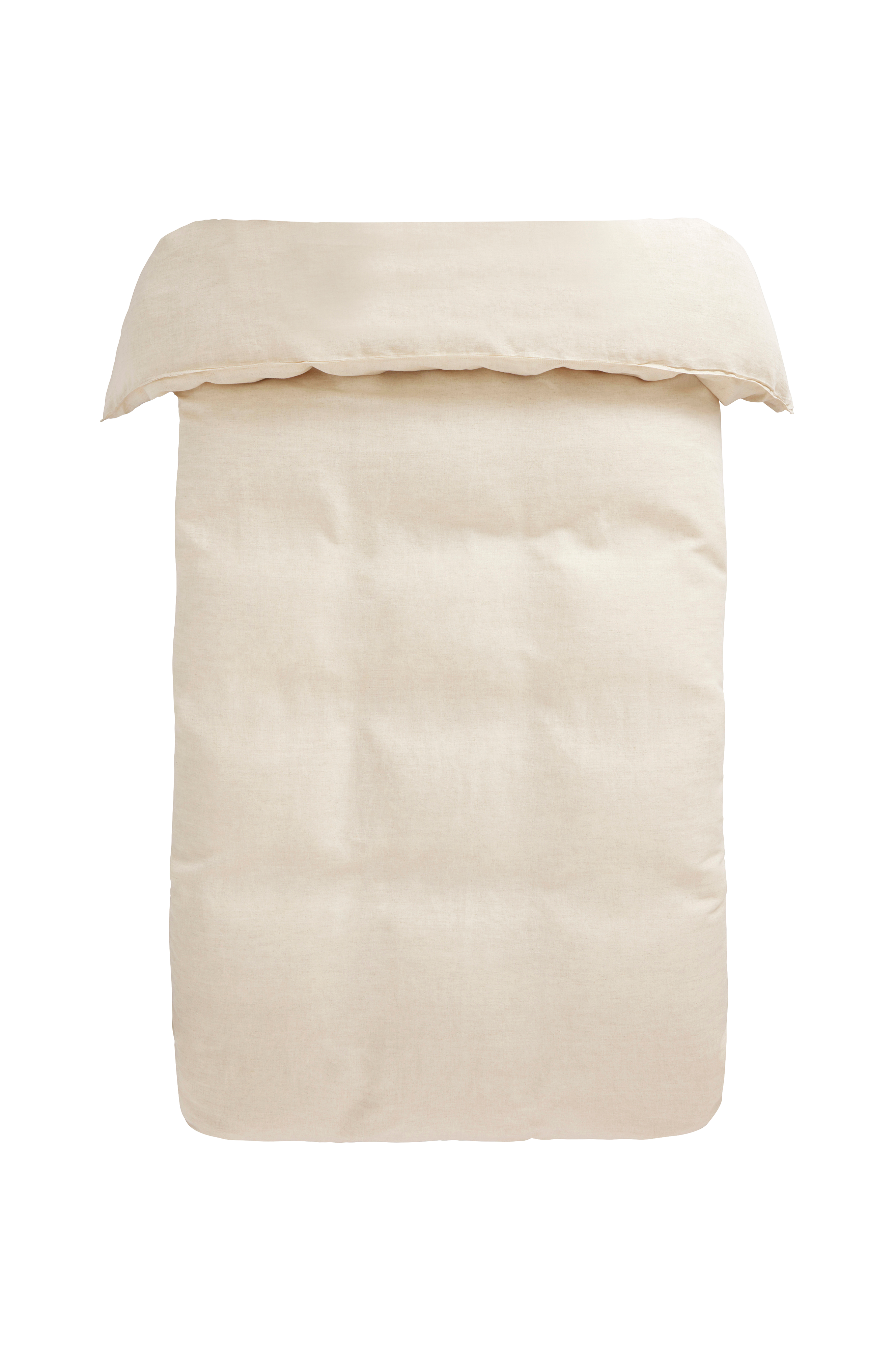 Dynetrekk i plaggvasket lin- og bomullsblanding. Dobbeltsømmer og knapper for lukking. Trådtetthet på 92 tc. (Trådtettheten forteller om antallet tråder, thread counts, pr. kvadrattomme i et stoff. Jo høyere trådtetthet, desto høyere kvalitet. Lin og linblanding blir ofte vevd litt løsere for å få den riktige følelsen.)