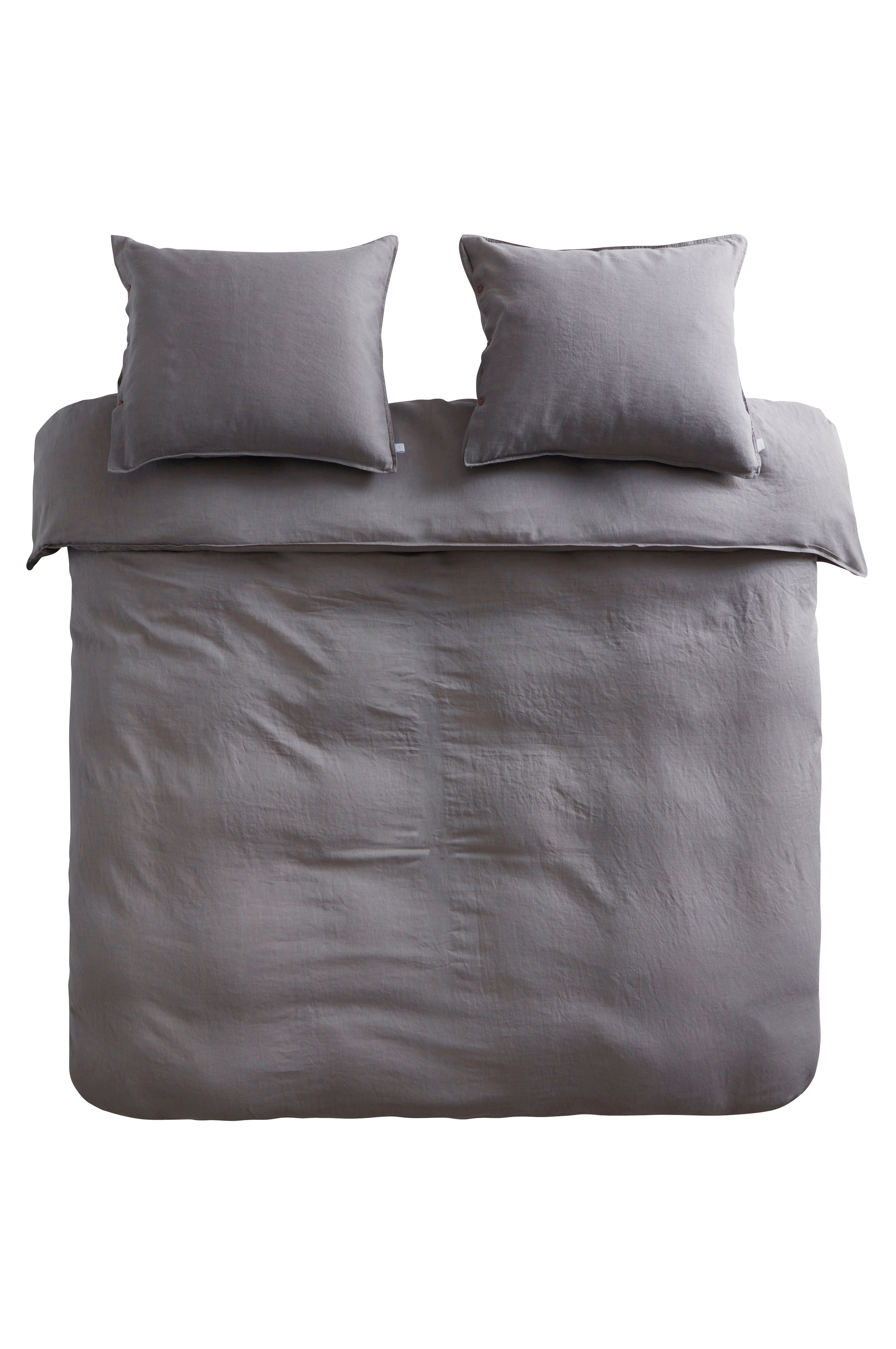 Sengesett i 3 deler av plaggvasket lin- og bomullsblanding. Dobbeltsømmer og knapper for lukking. Trådtetthet på 92 tc. (Trådtettheten forteller om antallet tråder, thread counts, pr. kvadrattomme i et stoff. Jo høyere trådtetthet, desto høyere kvalitet. Lin og linblanding blir ofte vevd litt løsere for å få den riktige følelsen.)