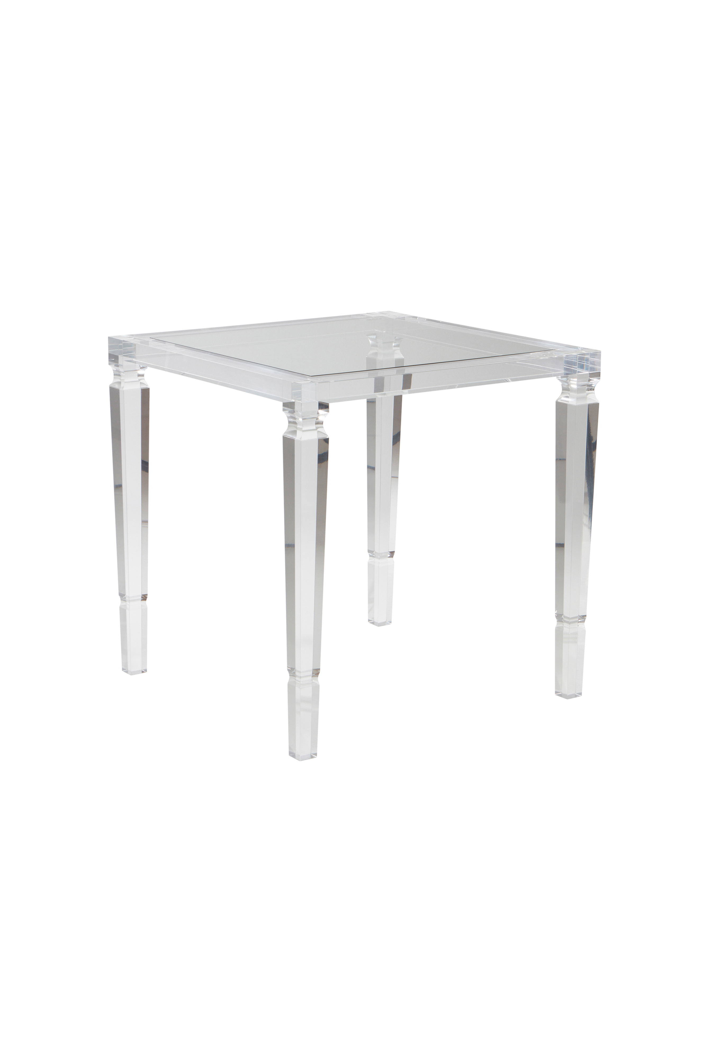 Firkantet, transparent sidebord med bordben i akrylglass og bordplate av herdet glass. Bordet er elegant og lett i stilige materialer.