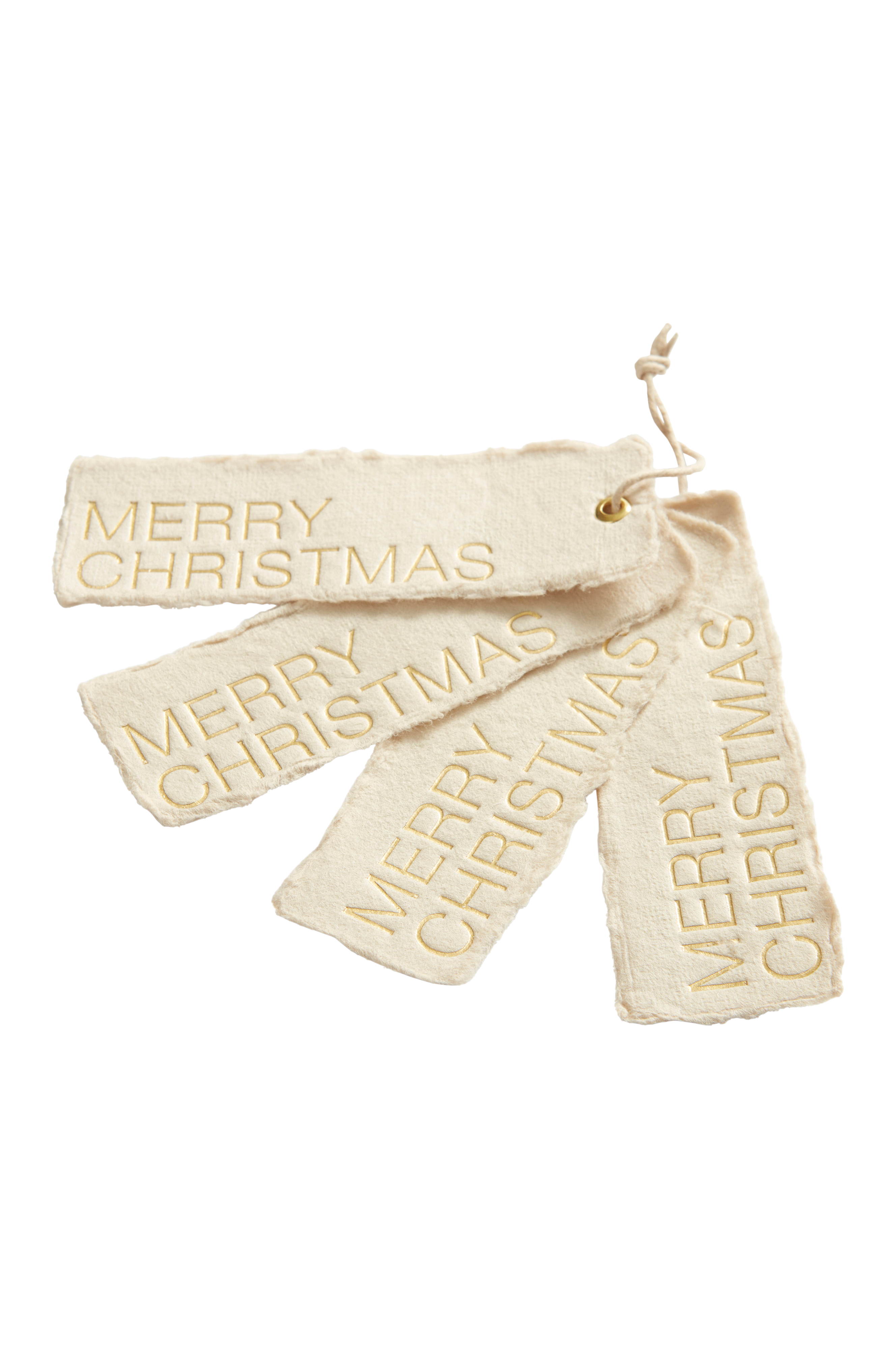 4-pk gavelapper av papir med tekst i sølv- eller gullfarge. Lappene er håndlagde, og gir både julegaver og vertinnegaver i julen en ekstra luksuriøs følelse. Hver gavelapp har en liten metallmalje til snor (snor medfølger ikke).
