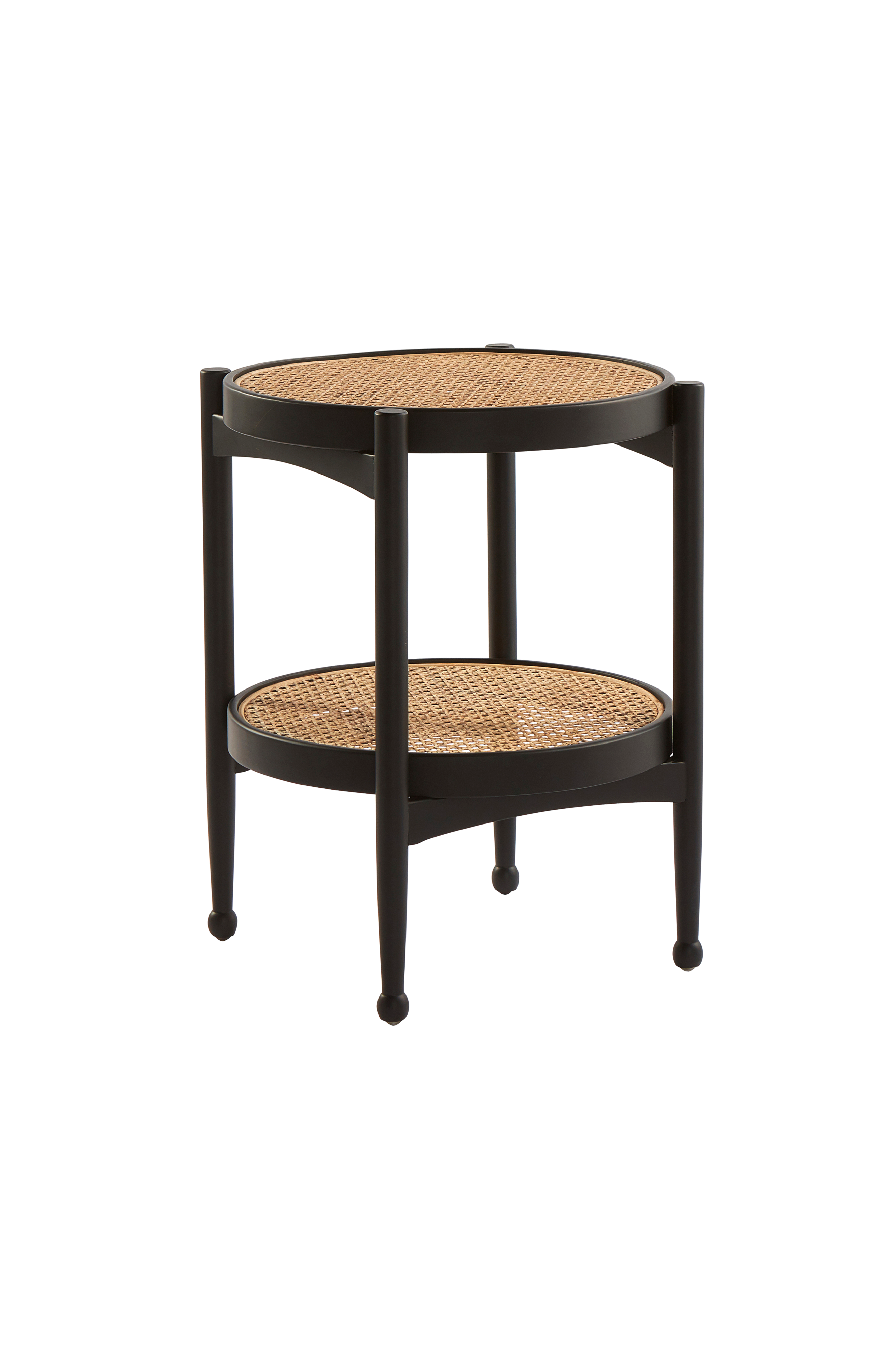 Lite, rundt sidebord med bordplate av rotting. Rammen rundt bordplaten og bena er av lys alm eller svartmalt bjørk.