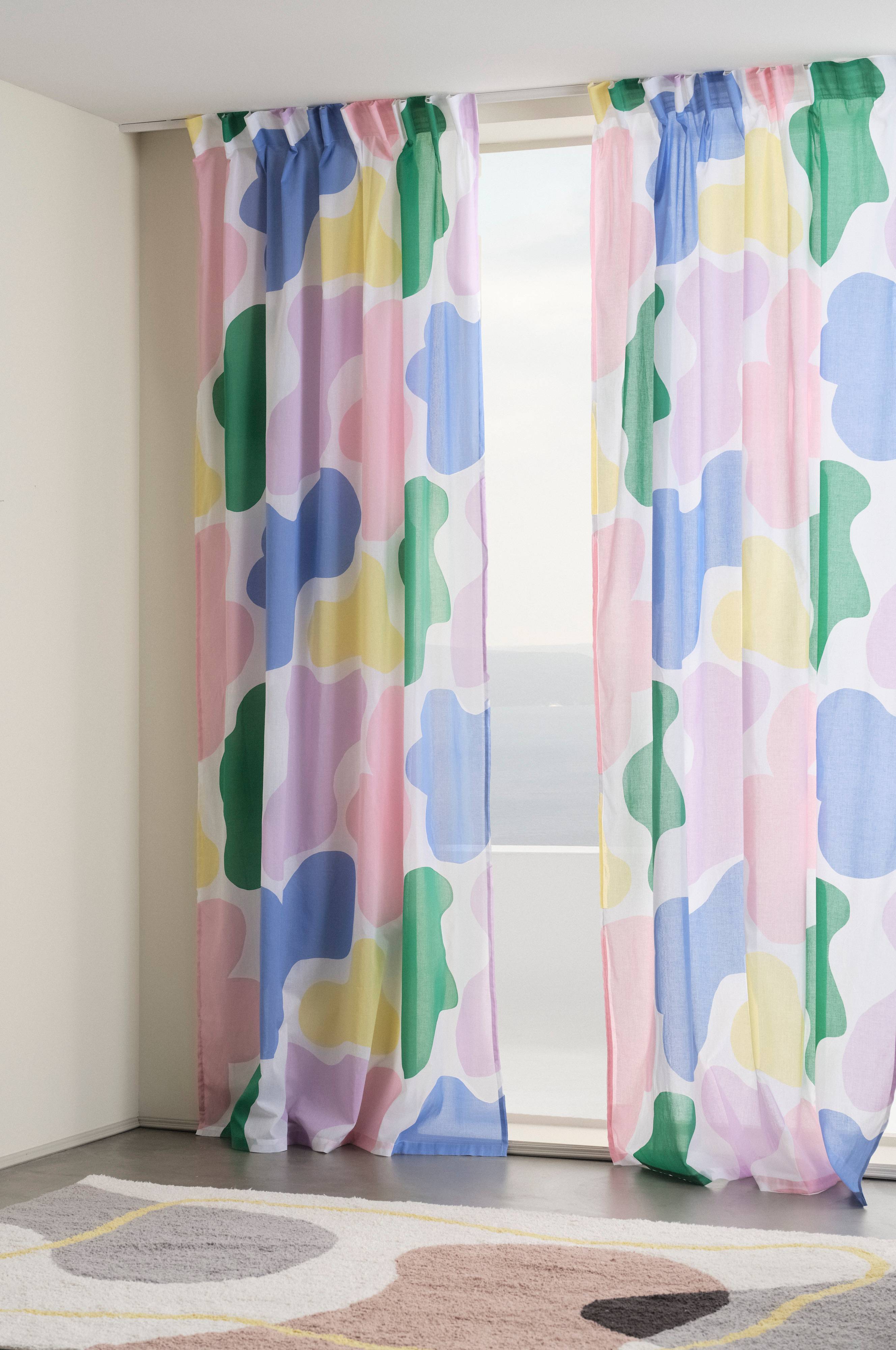 2-pk gardinlengder av bomull med søtt dyremønster trykt i kvikke pasteller på hvit bunn. Lengdene har påsydd multifunksjonsbånd, og kan henges opp med fingerkroker, kanal samt skjult hempe.