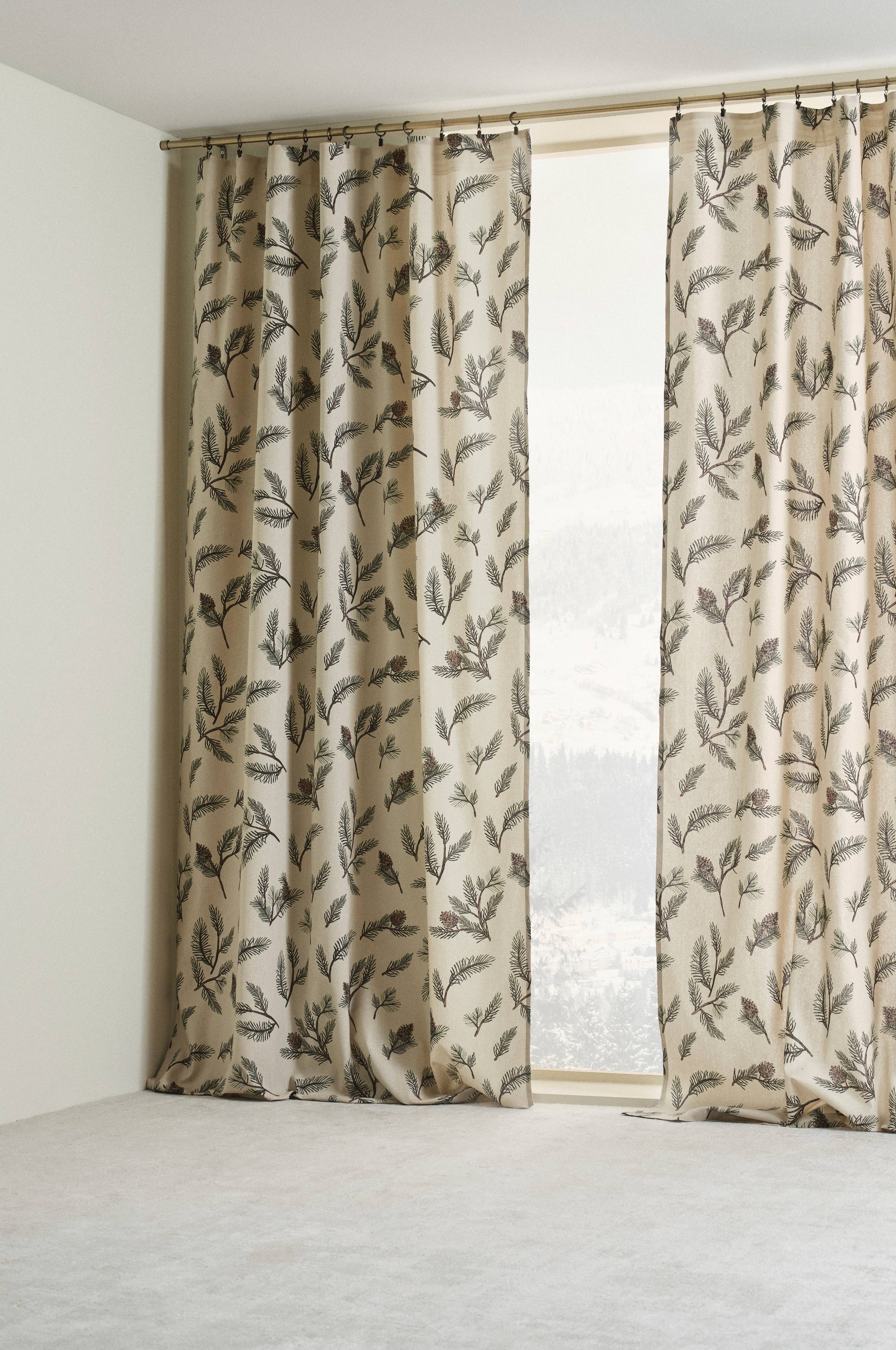 To gardinlengder i kraftig og samtidig litt løst vevd bomull. Kongler og grankvister gir mønsteret HOLLY sin herlige naturlige følelse. Mønstertrykket er inspirert av våre vakre skoger, og skaper herlig stemning til jul - men gjør seg like fint hele året. Påsydd multifunksjonsbånd øverst gjør det mulig å henge opp gardinen med fingerkroker, kanal samt skjult hempe.