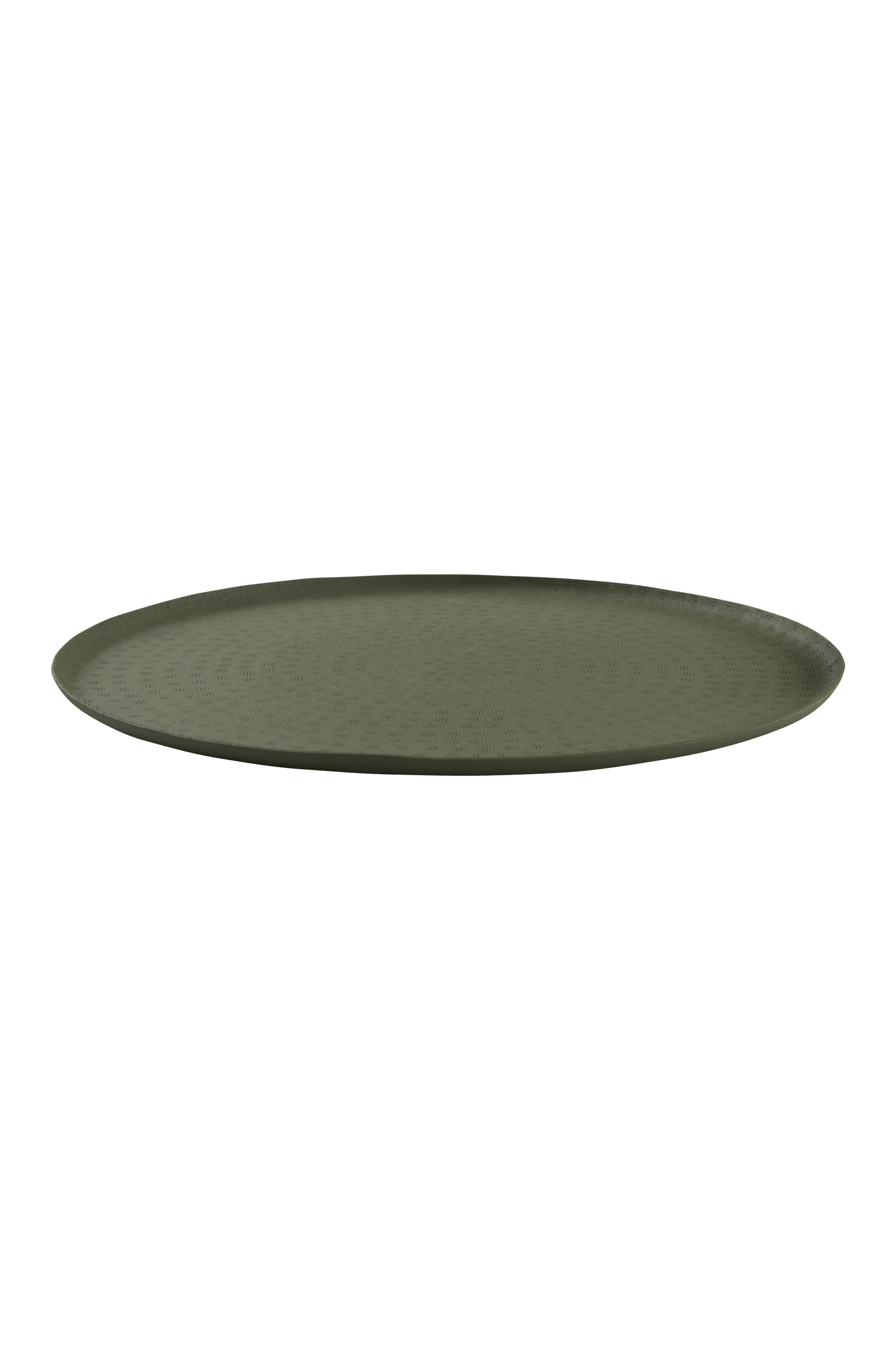 Rundt brett av aluminium, det svarte har pulverlakkert overflate og det gullfargede har tynn plettering. INALI har tekstur som gir følelsen av en hamret overflate og en liten, opphøyd kant rundt. Brettet er like fint til hverdagslunsjen som til festbobler.