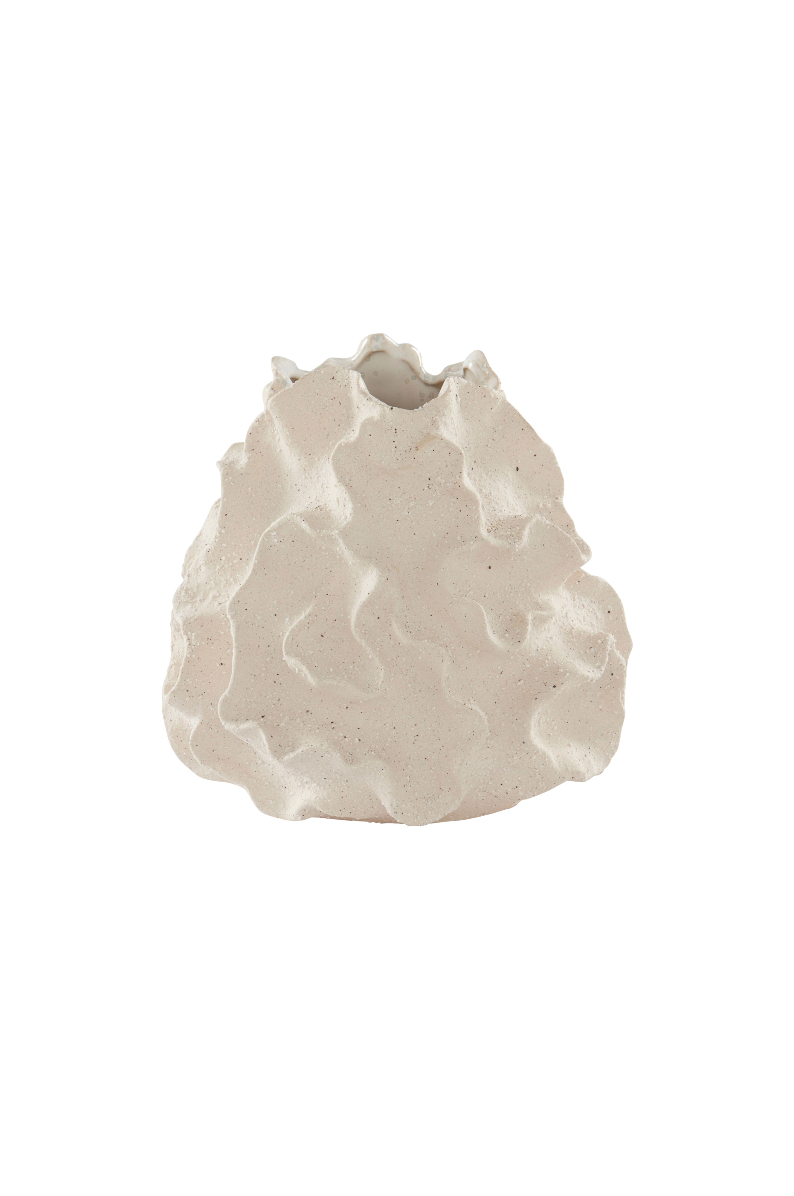 Vase av keramikk. IVA er håndlaget og har uregelmessig form som minner om havets koraller. Utsiden er matt med sandstruktur og innsiden er glasert. Et visst avvik kan forekomme ettersom vasen er håndlaget. Keramikk kan slippe gjennom fukt.
