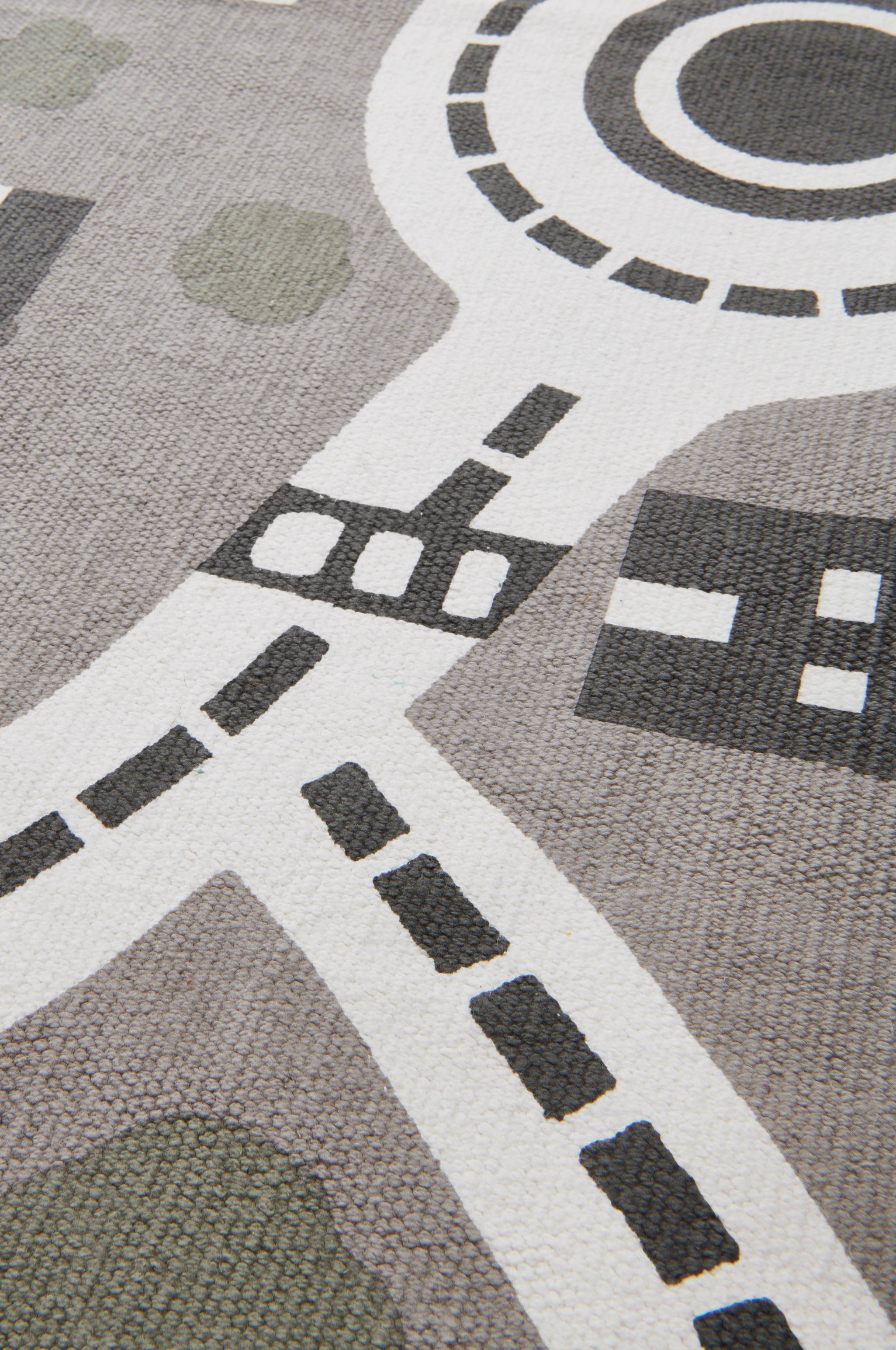 Håndvevd barneteppe av myk bomull med trykt mønster. Et fint og morsomt bilteppe med veier og hus som innbyr til fantasifull lek. Tykkelse 0,2-0,3 cm. 850-950 g/m².
