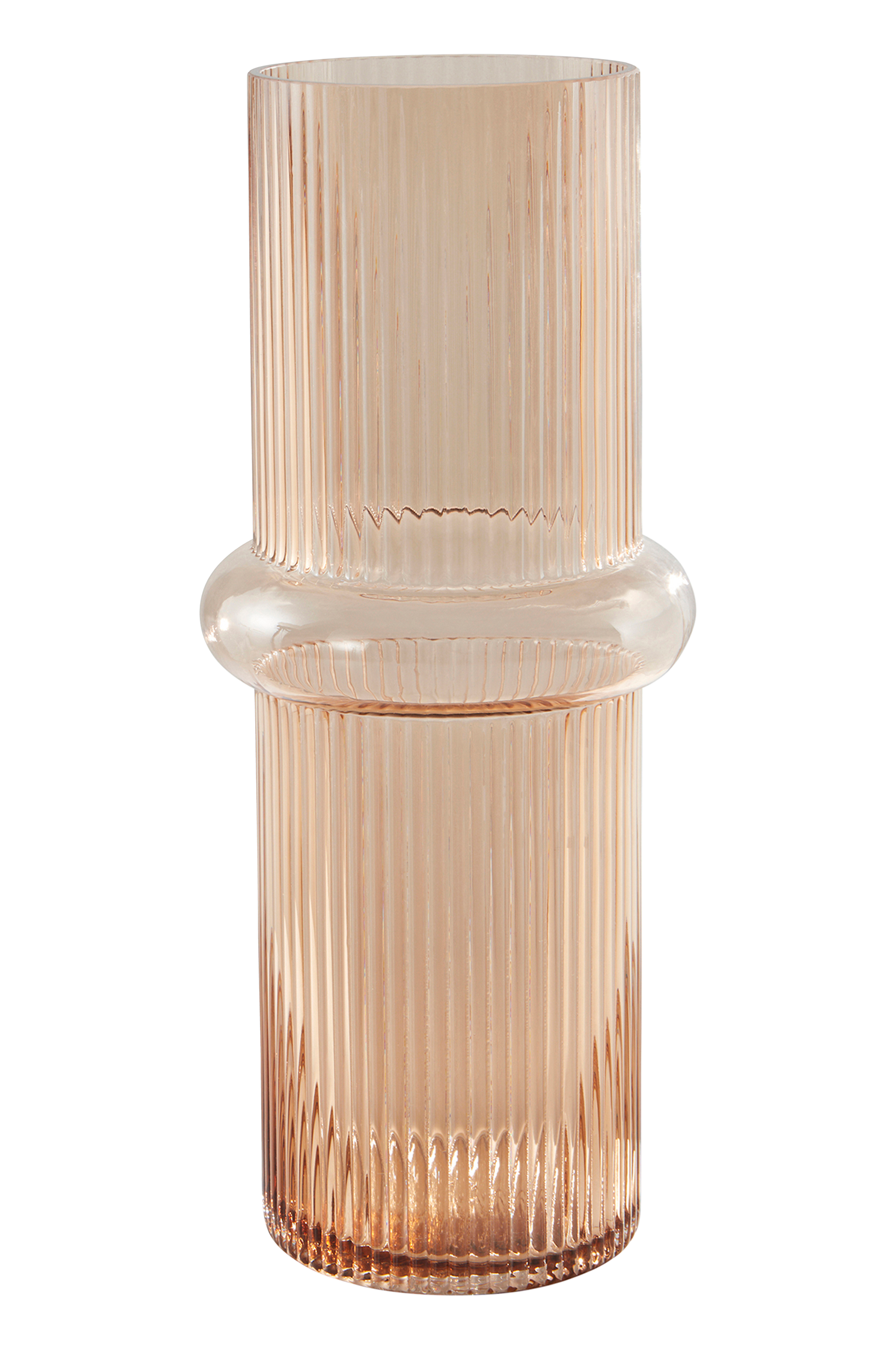 Vase av stripete glass. Vasen har pen form og stripene i glasset gir fin effekt sammen med den retroinspirerte formen. Størrelsen gjør at vasen passer til de høye, vakre snittblomstene som for eksempel liljer, roser og gladioler.