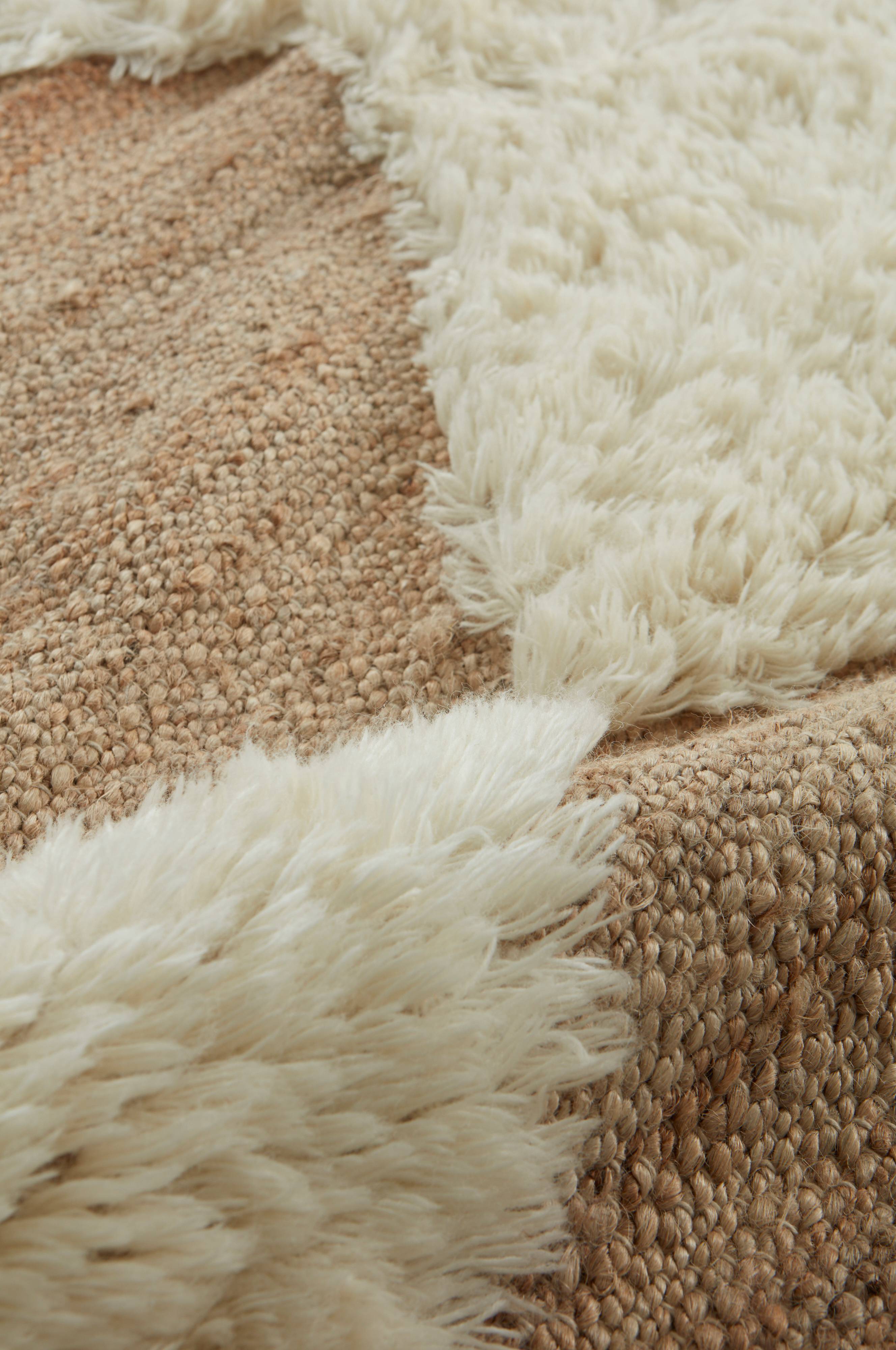 Håndvevd teppe av ull med litt iblandet bomull. Den myke og varme luggen er helt i ull, og teppet har pent rombemønster i to beige nyanser hvor ulike lugghøyder skaper ekstra effekt. Den fine kvaliteten gjør teppet lettstelt - ull er naturlig smussavvisende og svært praktisk. Ull er dessuten varm og deilig å sette føttene på. Lugghøyde 1,1-1,2 cm. Tykkelse 2,6-2,8 cm. 2800-3000 g/m².