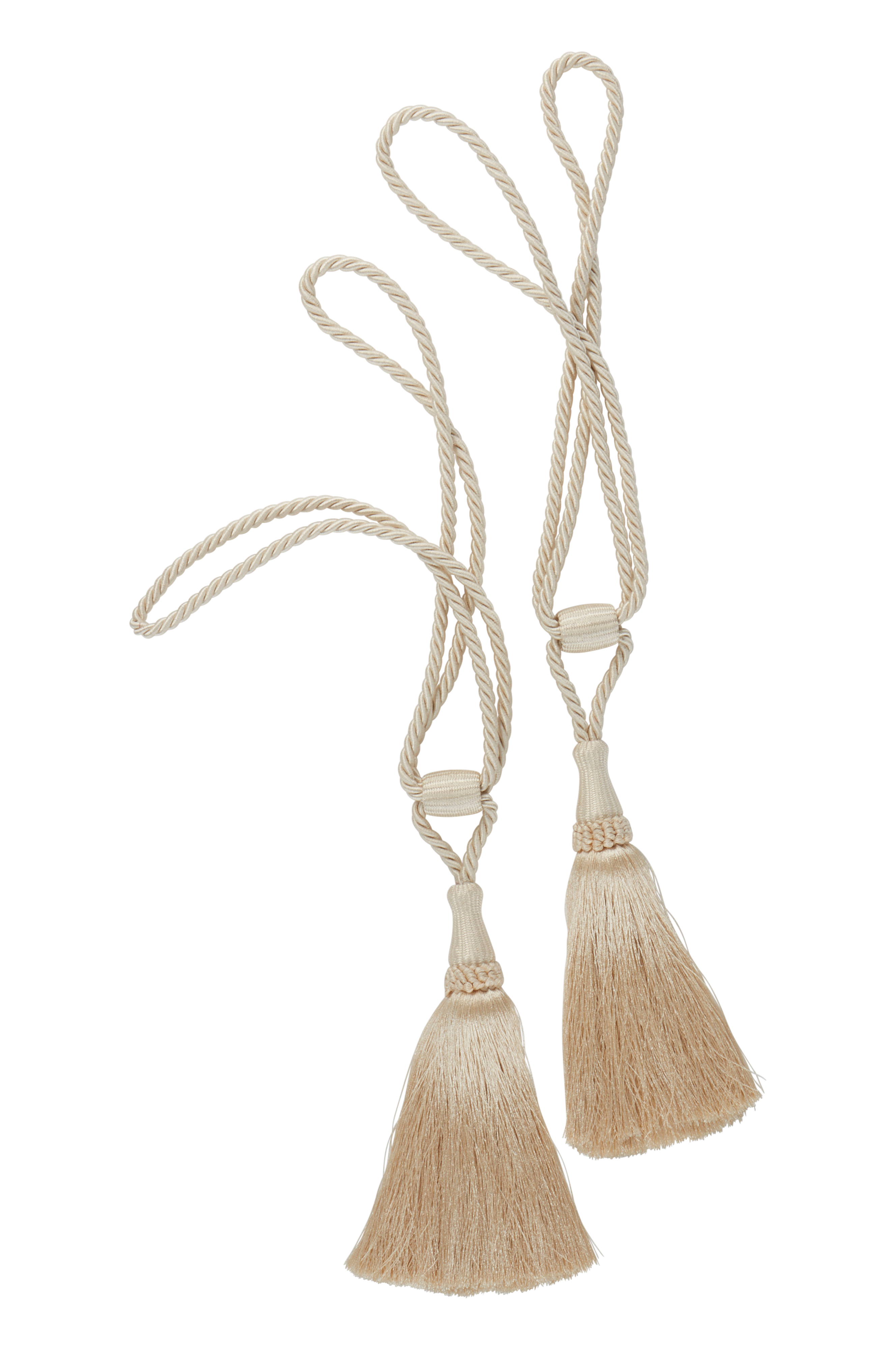 2-pk gardinbånd av polyester. Båndene er ensfargede med en fin plastperle som er tvunnet med tråd og en kraftig dusk.