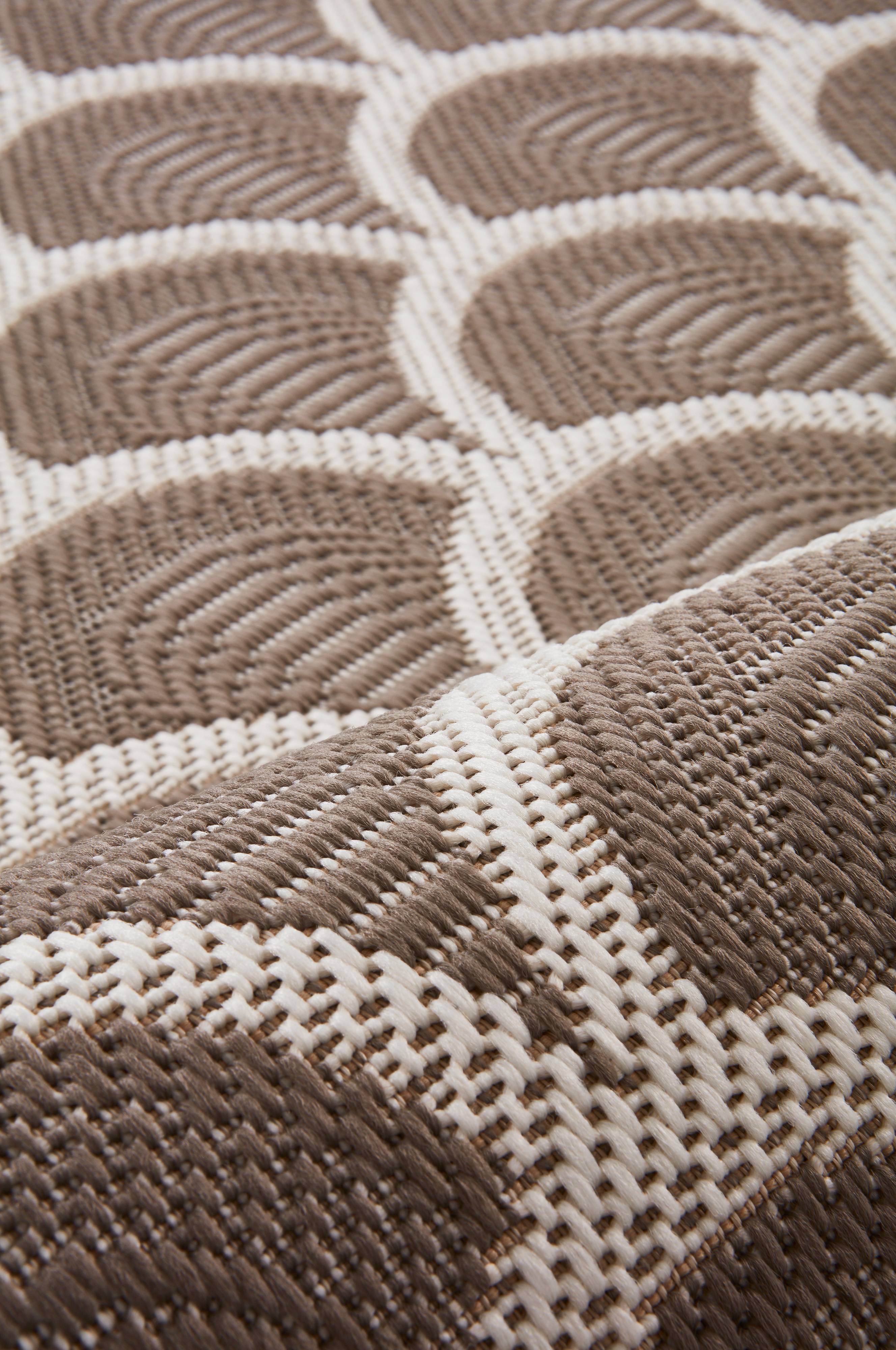 Glattvevd teppe laget av resirkulert polyester, teppet har et fint sløyfemønster. Dette er en behagelig kvalitet som både føles og ser ut som bomull, men som er laget av resirkulert polyester. Et herlig teppe som du kan bruke både innendørs og utendørs. Det tåler både fukt og regn. Tykkelse 0,4 cm. 1000 g/m².