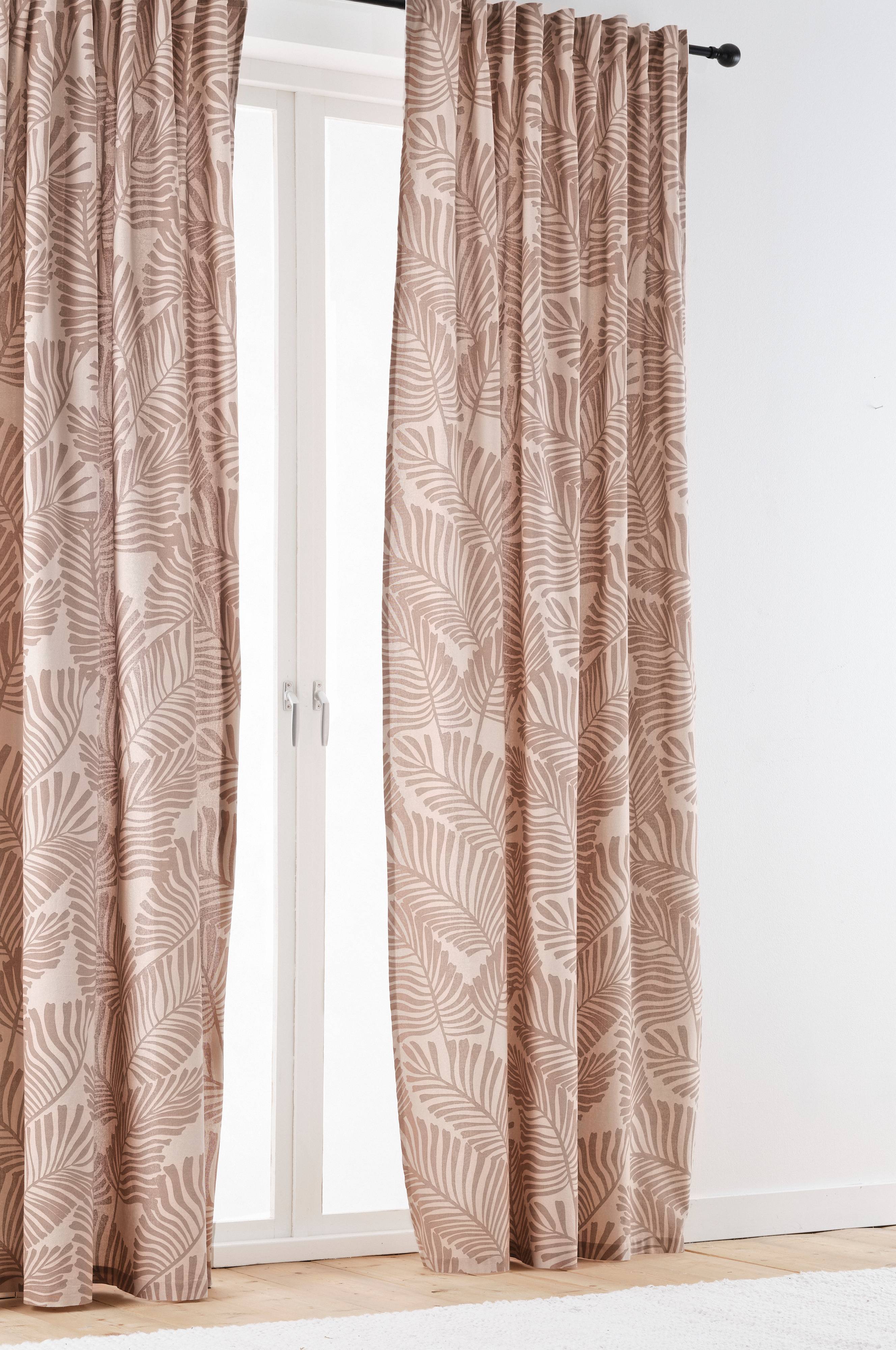 To gardinlengder i halvpanama med trykt mønster og påsydd multifunksjonsbånd. Gardinen kan henges opp med fingerkroker, kanal samt skjult hempe. Tropisk inspirasjon møter den grafisk rene stilen og skaper et anvendelig mønster, både sammen med andre mønstre og med ensfarget.