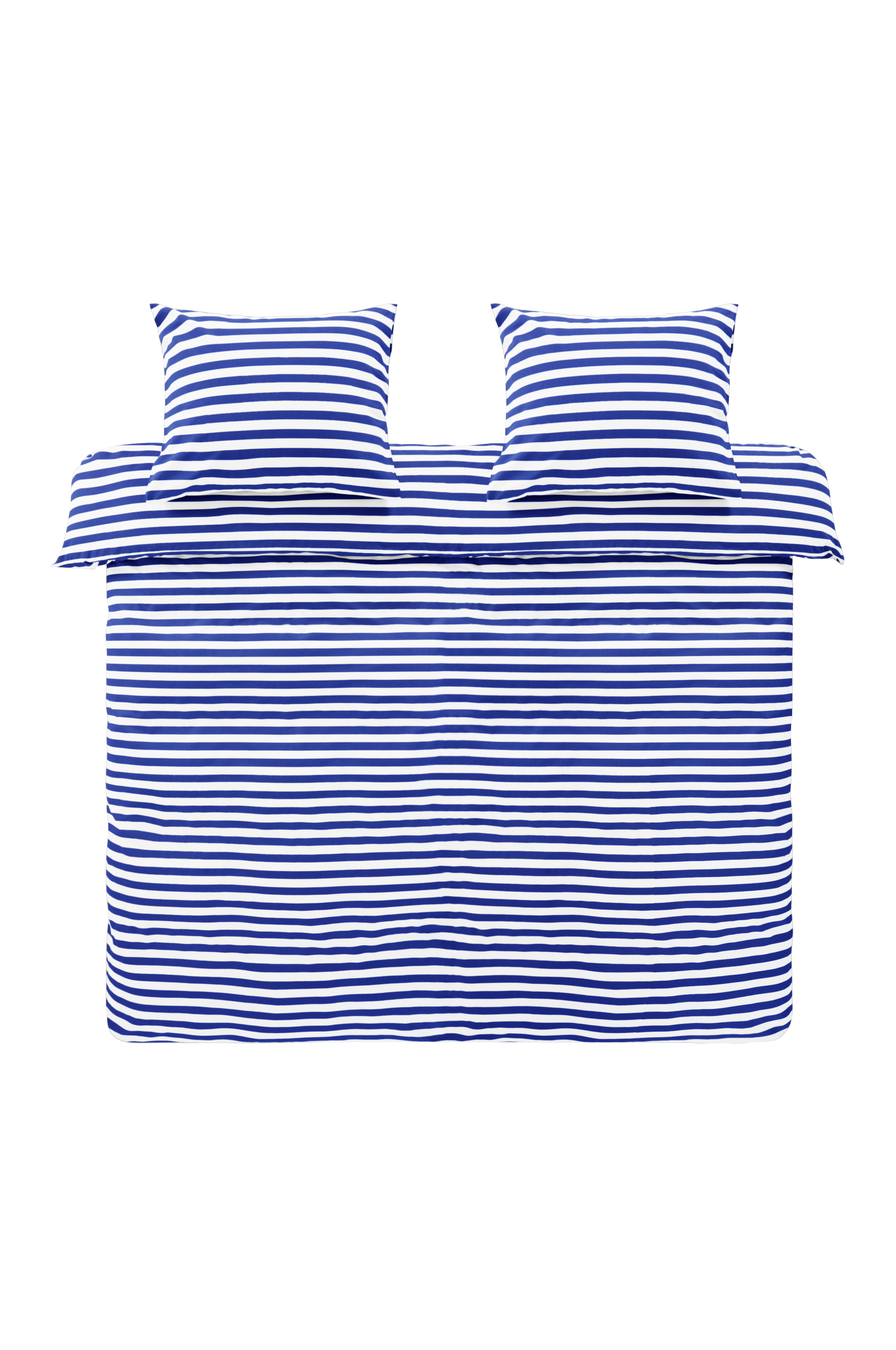 Stripete dynetrekk i tre deler, ett ekstra bredt dynetrekk og to putevar i bomull. Den tverrgående stripen er trykt i friske, sommerlige farger på begge sider av putevarene og dynetrekket. Bomull er en myk og behagelig kvalitet som føles sval mot huden.