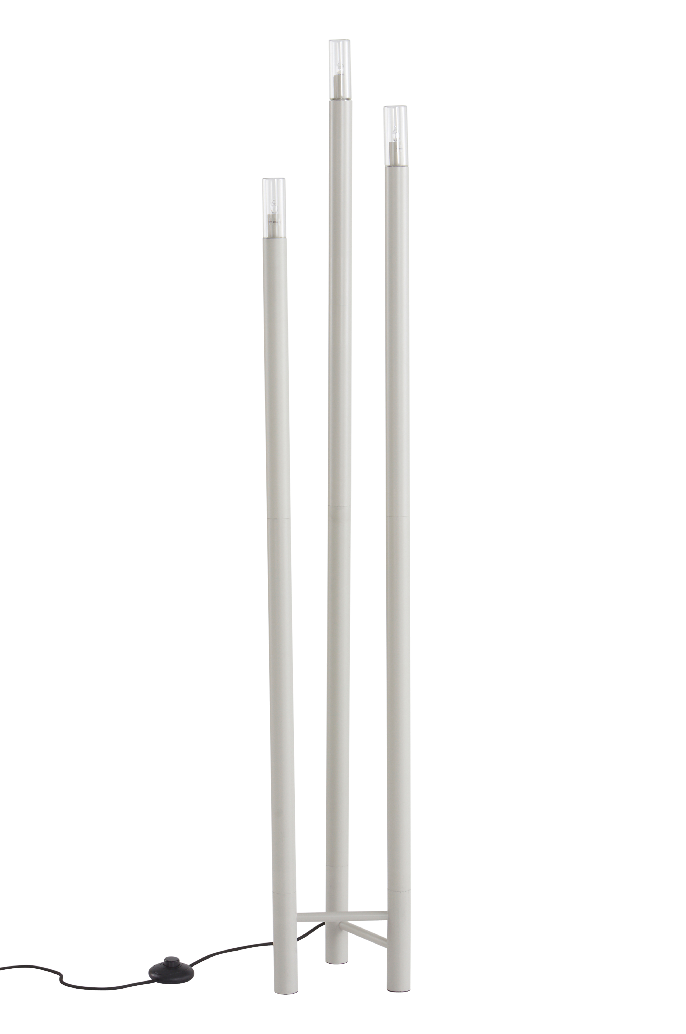 Gulvlampe av jern hvor klart glass er kombinert med mattlakkert finish. Lampen er stilren og har tre lyskilder som lyser fint.