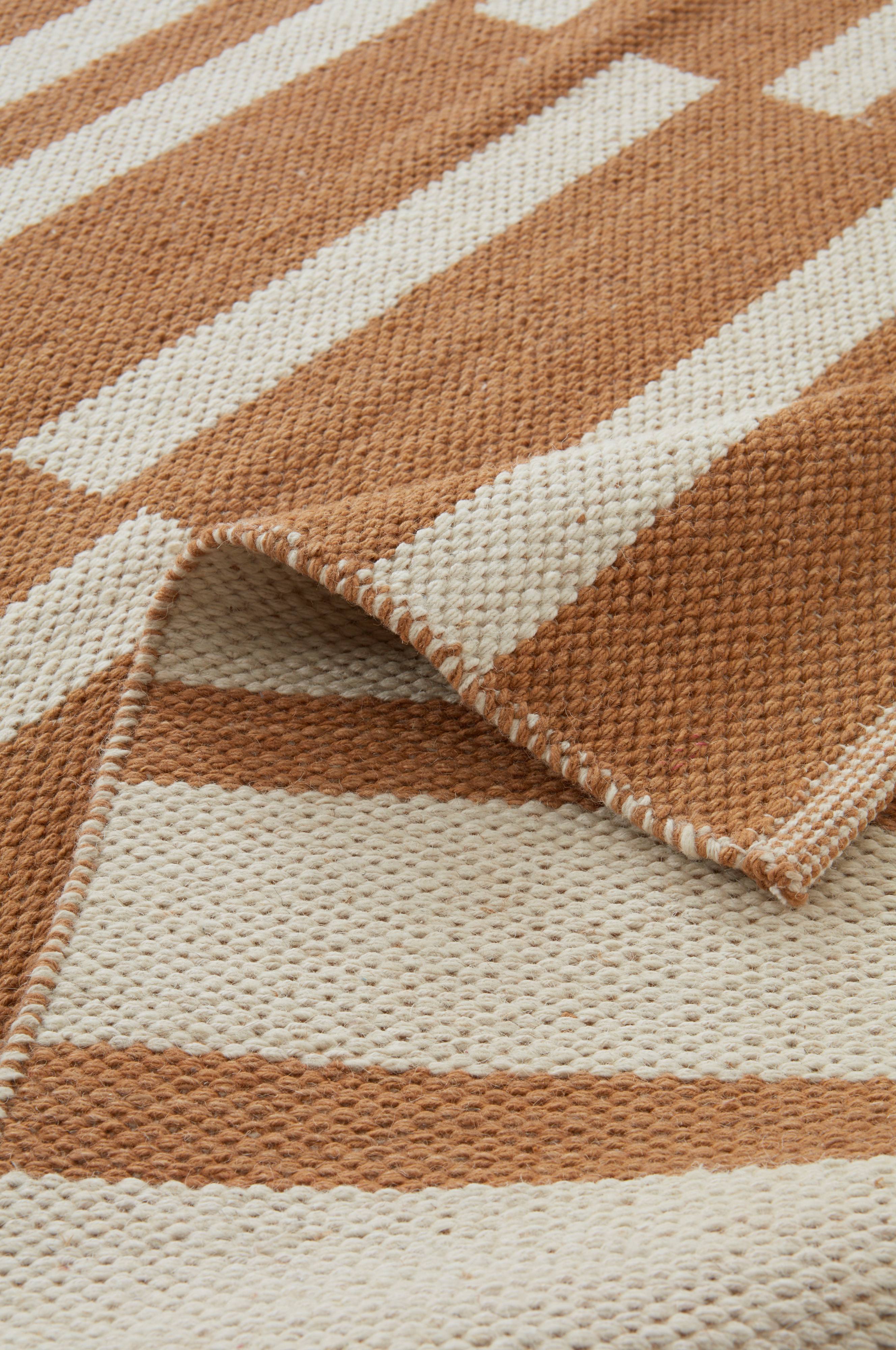 Håndvevd teppe i herlig, varm ullblanding med litt bomull innblandet. KENZI er marokkansk i stilen med et spesielt stripemønster som gir et livlig teppe i naturnære farger. Ull er et naturlig materiale som varmer deilig, og er helt perfekt for deg som har litt kalde gulv hjemme. Ull er dessuten et praktisk valg siden ull er naturlig smussavvisende. Det fine håndverket gjør hvert teppe unikt. Tykkelse 0,8 cm. 1900 g/m².