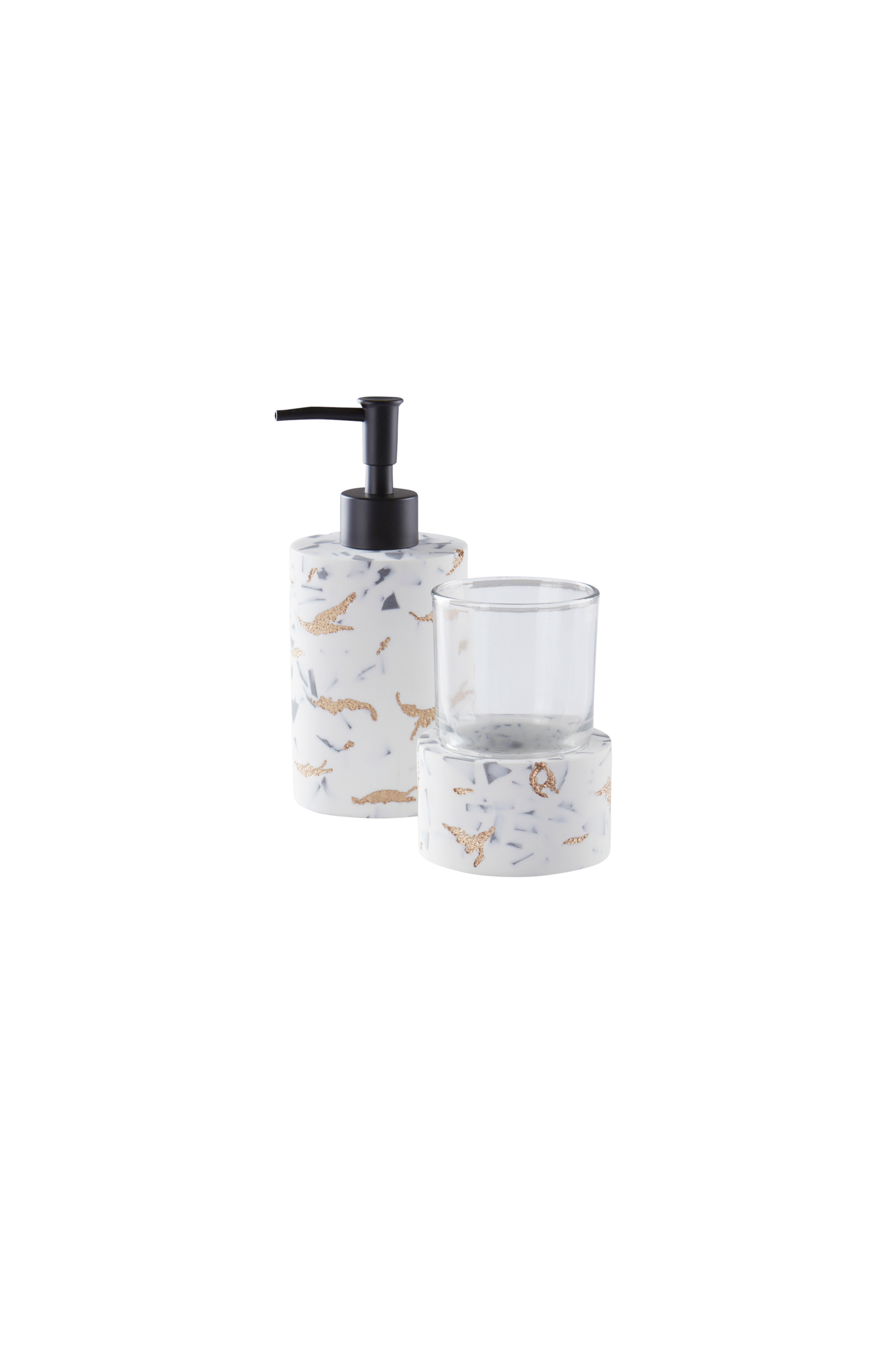 Baderomssett med to deler i polyresin og glass. Det fine baderomssettet er inspirert av marmor med innslag av gull, men er i et mer solid og lett materiale som passer bedre på badet. Settet inneholder et glass med holder og en dispenser med svart plastpumpe. Dispenseren fyller du med din flytende favorittsåpe. Det er et bedre miljøvalg å kjøpe refill da plastmengden reduseres. Den kan også brukes til hudlotion eller sjampo.