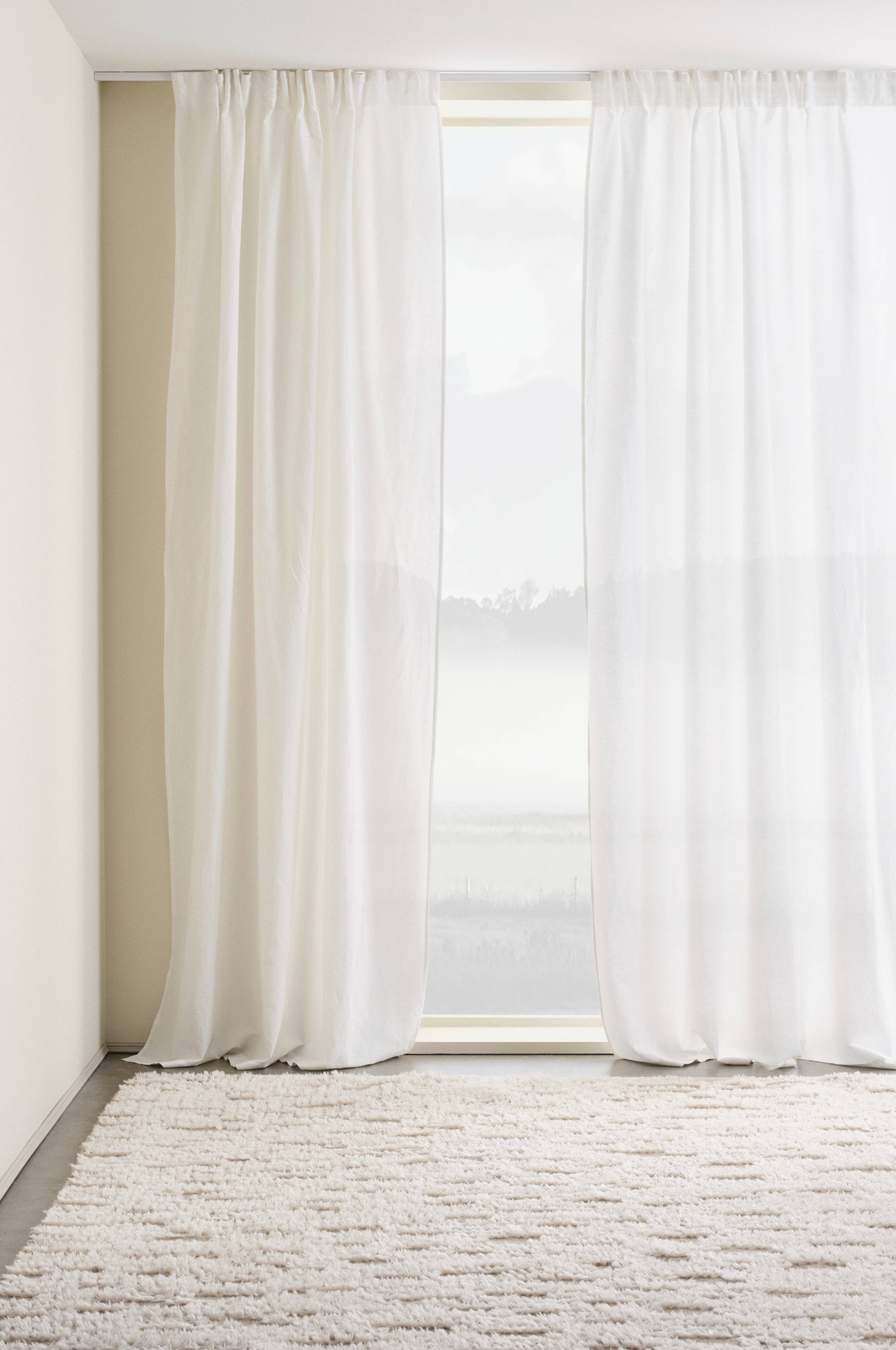 To gardinlengder i en fin linblanding der linet er blandet med bomull. Blandingen av bomull og lin gir en lettstelt kvalitet med fordelene fra både bomull og lin. Linet gir den litt fastere strukturen, og sammen med den myke bomullen blir stoffet fleksibelt og faller fint. Lengdene har påsydde multifunksjonelle stropper og kan henges opp med fingerkroker eller skjulte kleshengere. Ensfarget er lett å matche og passer like godt sammen med ensfargede tekstiler i matchende farger som med mønstrede.