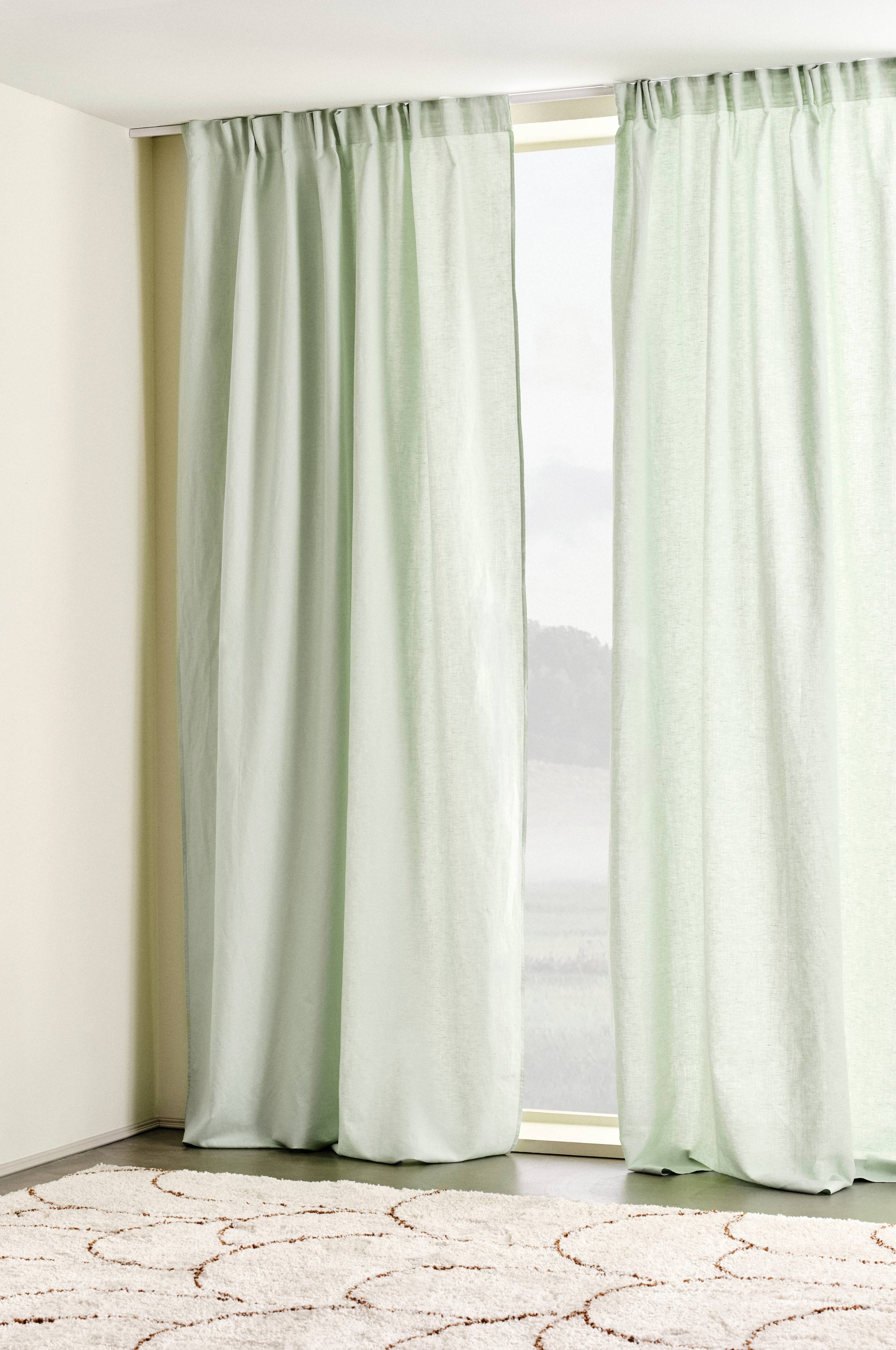 To gardinlengder i en fin linblanding der linet er blandet med bomull. Blandingen av bomull og lin gir en lettstelt kvalitet med fordelene fra både bomull og lin. Linet gir den litt fastere strukturen, og sammen med den myke bomullen blir stoffet fleksibelt og faller fint. Lengdene har påsydde multifunksjonelle stropper og kan henges opp med fingerkroker eller skjulte kleshengere. Ensfarget er lett å matche og passer like godt sammen med ensfargede tekstiler i matchende farger som med mønstrede.