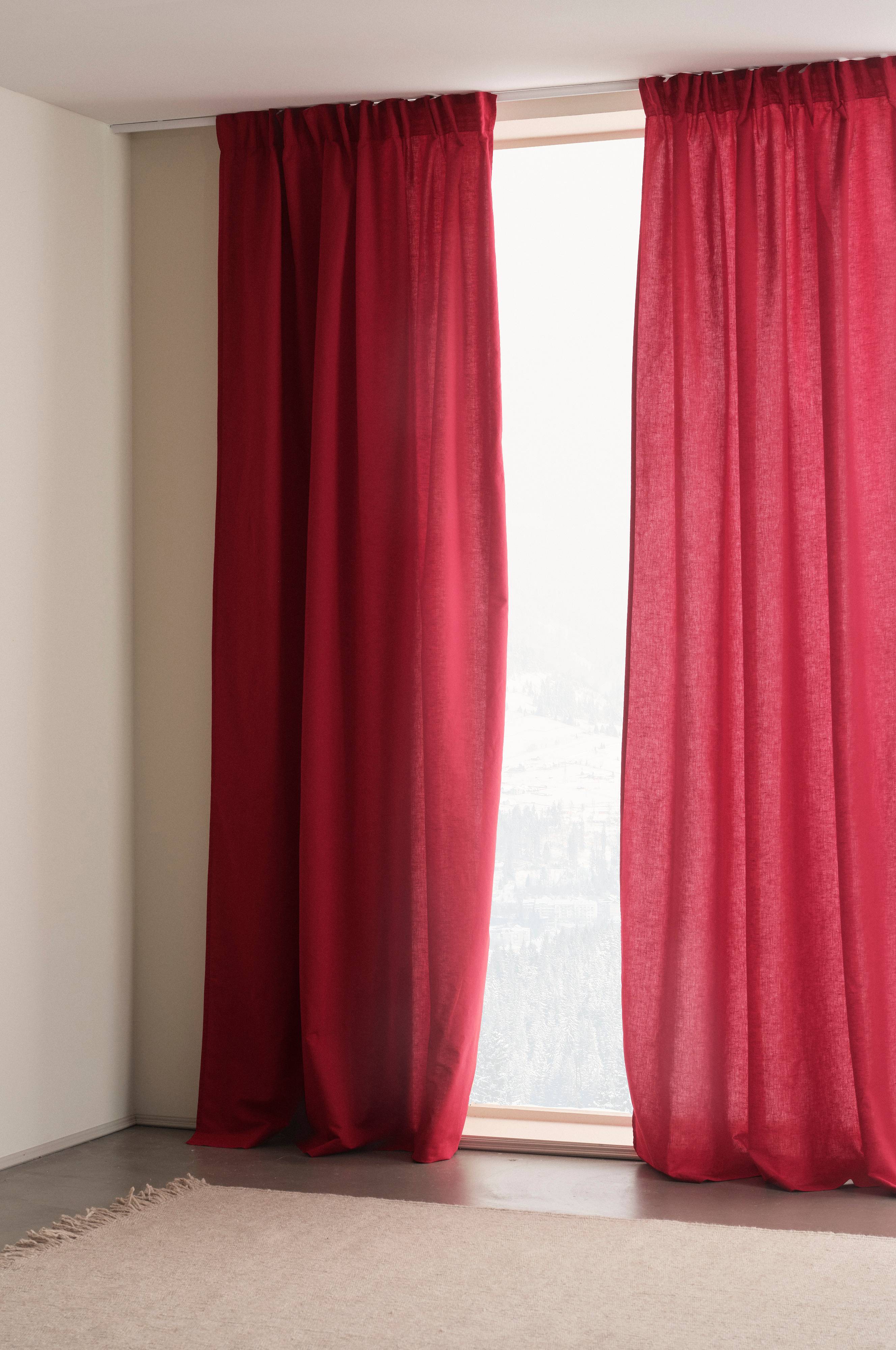 To gardinlengder i en fin linblanding der linet er blandet med bomull. Blandingen av bomull og lin gir en lettstelt kvalitet med fordelene fra både bomull og lin. Linet gir den litt fastere strukturen, og sammen med den myke bomullen blir stoffet fleksibelt og faller fint. Lengdene har påsydde multifunksjonelle stropper og kan henges opp med fingerkroker eller skjulte kleshengere. Ensfarget er lett å matche og passer like godt sammen med ensfargede tekstiler i matchende farger som med mønstrede.