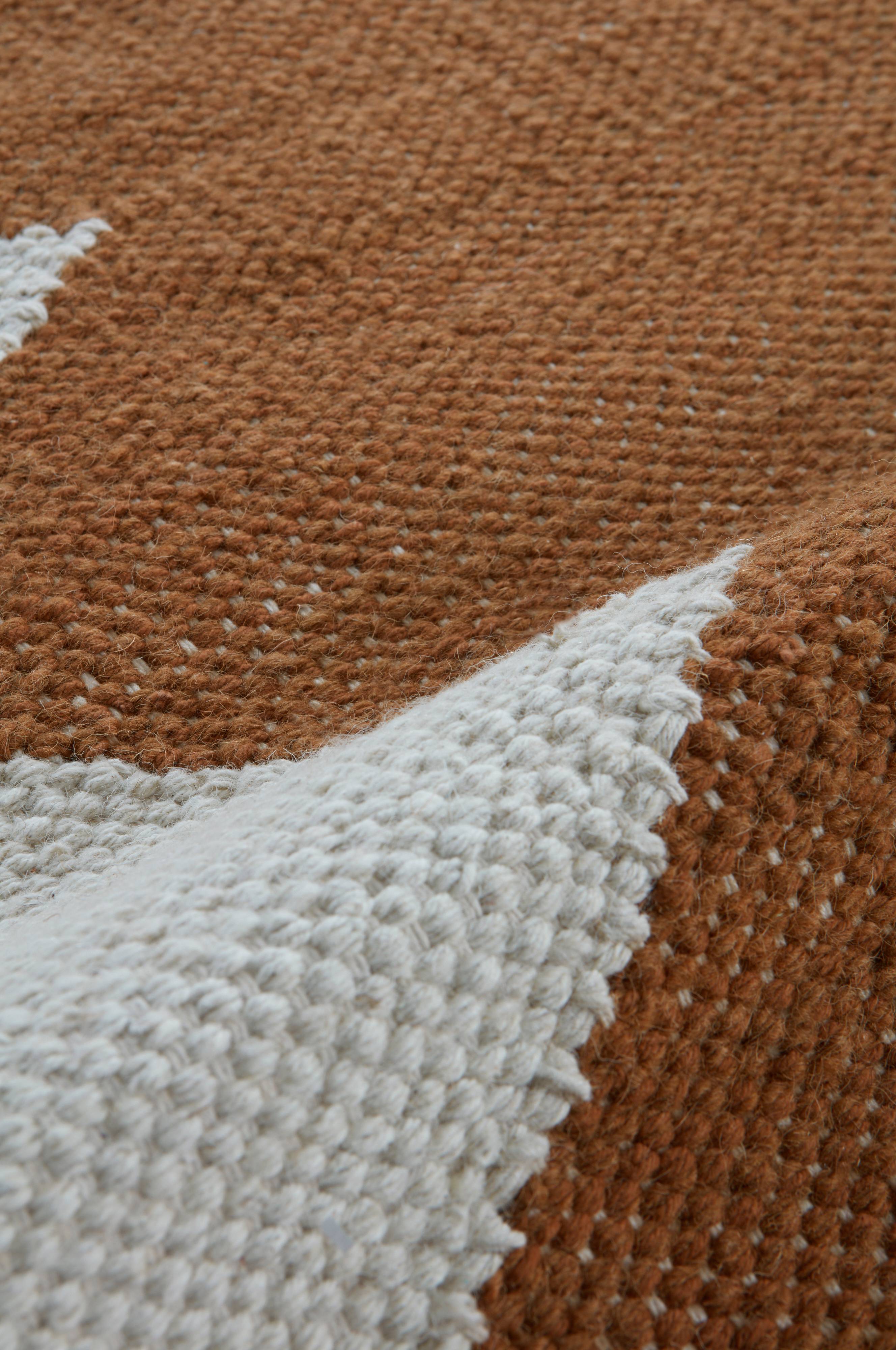 Håndvevd bomullsteppe med vevd, garnfarget mønster. Teppet har en lys sikksakkbord rundt som gir fin innramming. Teppet av bomull er behagelig mykt, demper lyd og gir samtidig rommet en varm atmosfære. Det er lettstelt og smidig. Det fine håndverket gjør hvert teppe unikt. Tykkelse 0,5 cm. 1200 g/m².