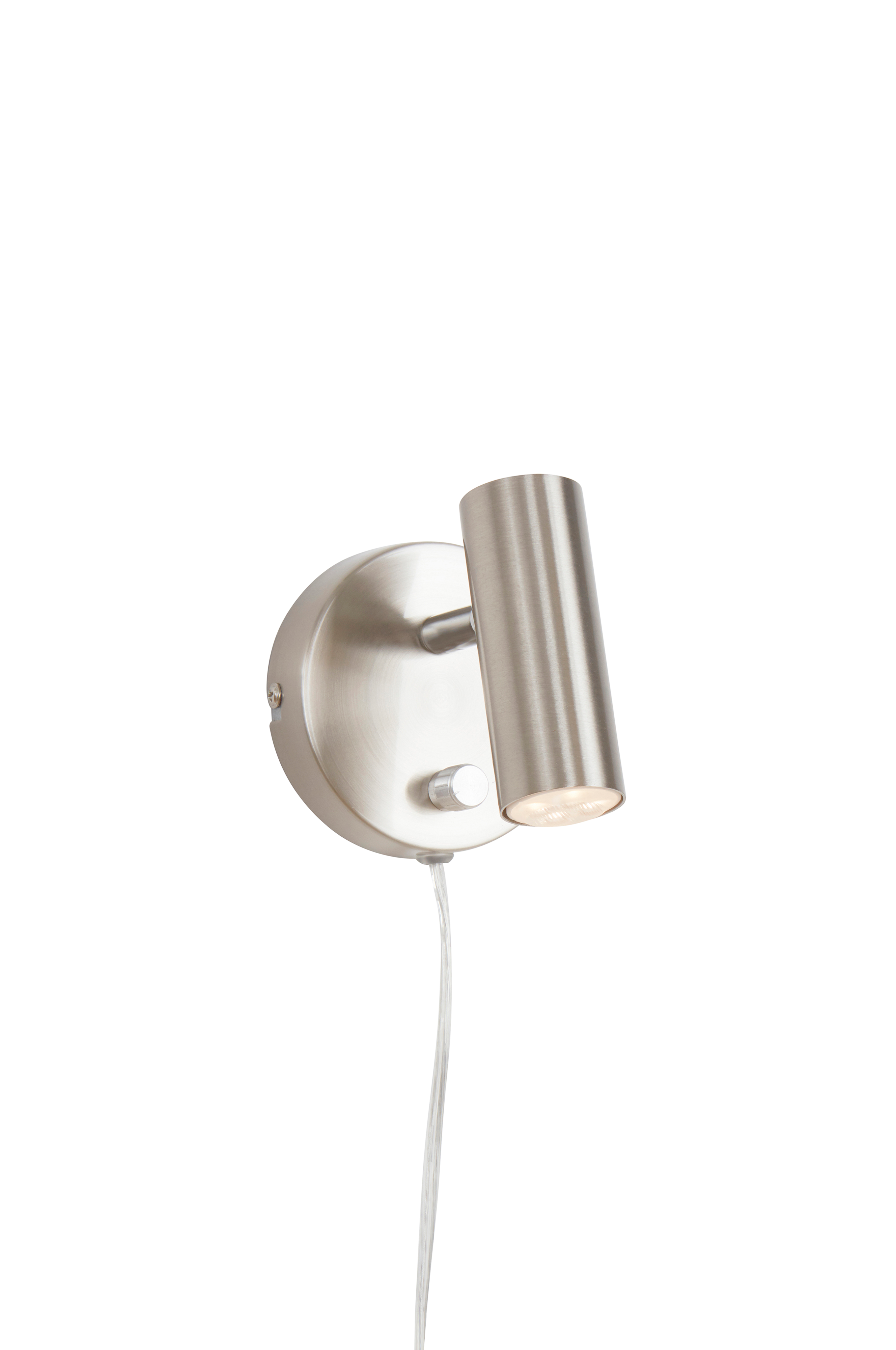 Vegglampe i metall inklusive LED-belysning. Justerbart lampehode med dimmer/strømbryter på veggplaten. Ensfarget utside og detaljer i krom. Ledning i plast, 170 cm.