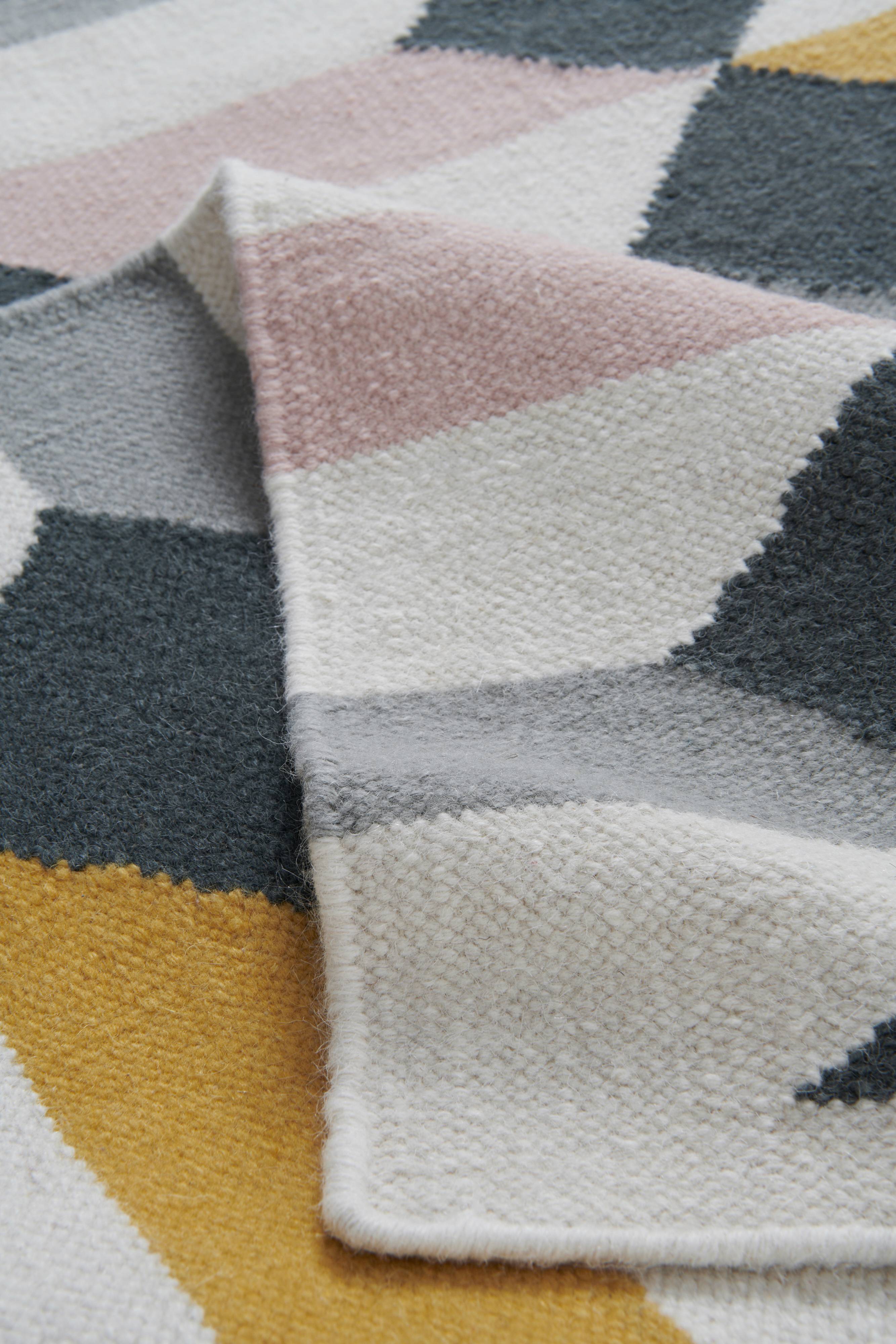 Håndvevd teppe av garnfarget ull med grafisk mønster på lys bunn. Teppet er mykt å gå på, vakkert for øyet og har et tidløst design som holder seg over tid. LEMONI passer inn i mange ulike stiler og trender.