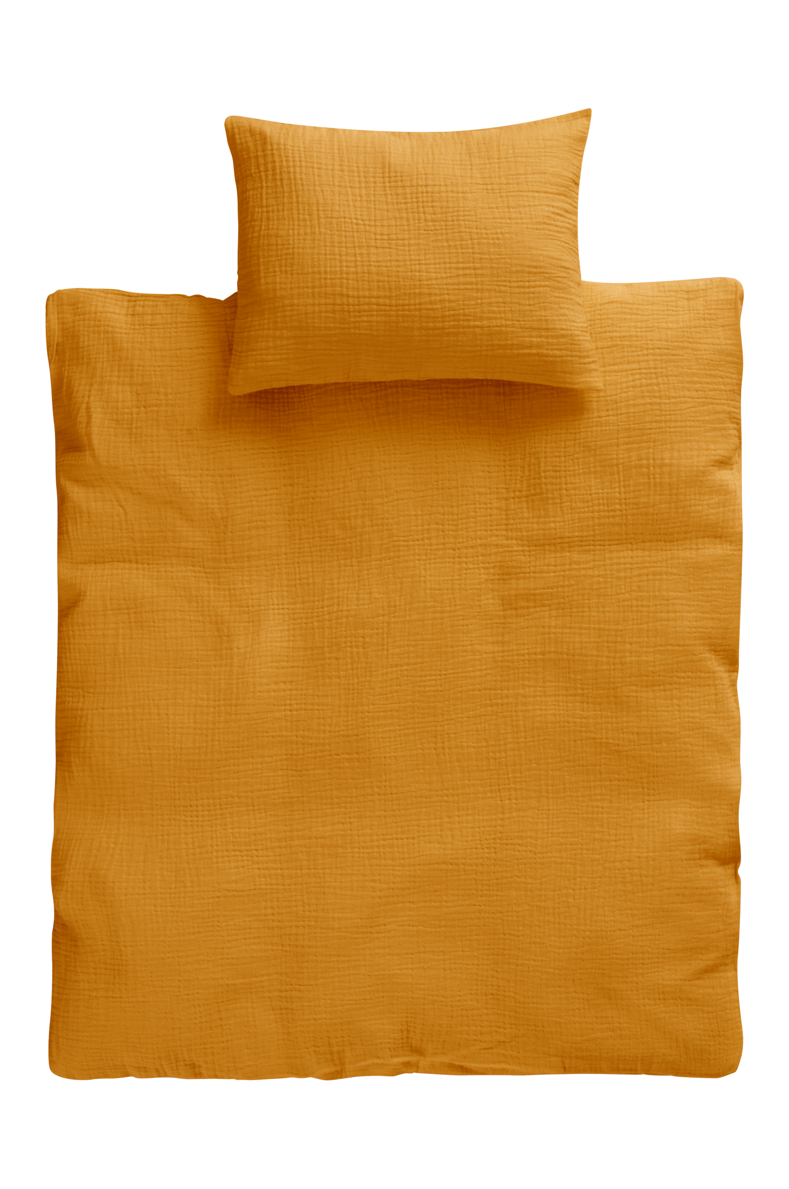 Sengesett i 2 deler i herlig, økologisk bomullsmusselin. Settet passer til barnevogn og vugge. Musselin er et mykt stoff, vevd med boblete effekt som gjør stoffet mykt og ekstra lettstelt. Du trenger hverken stryke eller mangle. Det behagelige musselinstoffet er deilig å sove i. Åpning øverst i hjørnene på dynetrekket. Det gjør det lettere å tre dynetrekket over dynen. Trådtetthet på 178 tc. (Trådtettheten forteller om antallet tråder, thread counts, pr. kvadrattomme i et stoff. Jo høyere trådtetthet, desto høyere kvalitet.)