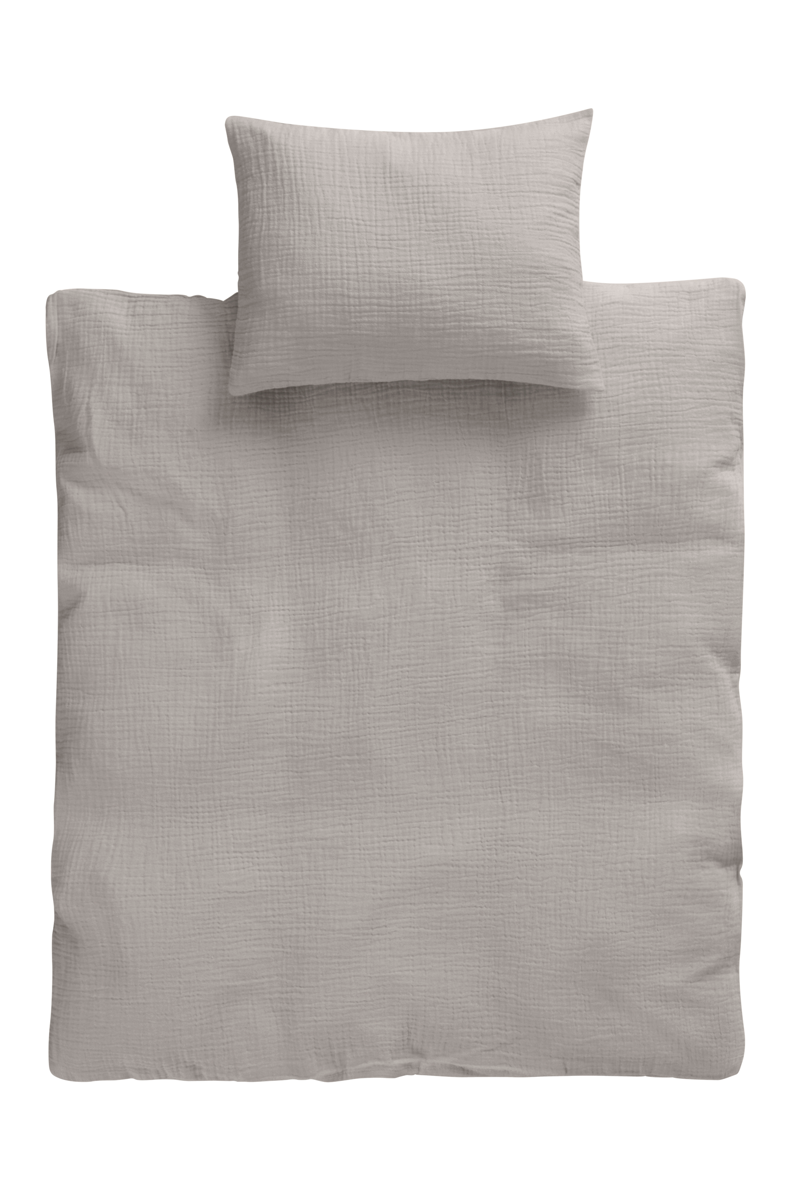 Sengesett i 2 deler i herlig, økologisk bomullsmusselin. Settet passer til barnevogn og vugge. Musselin er et mykt stoff, vevd med boblete effekt som gjør stoffet mykt og ekstra lettstelt. Du trenger hverken stryke eller mangle. Det behagelige musselinstoffet er deilig å sove i. Åpning øverst i hjørnene på dynetrekket. Det gjør det lettere å tre dynetrekket over dynen. Trådtetthet på 178 tc. (Trådtettheten forteller om antallet tråder, thread counts, pr. kvadrattomme i et stoff. Jo høyere trådtetthet, desto høyere kvalitet.)