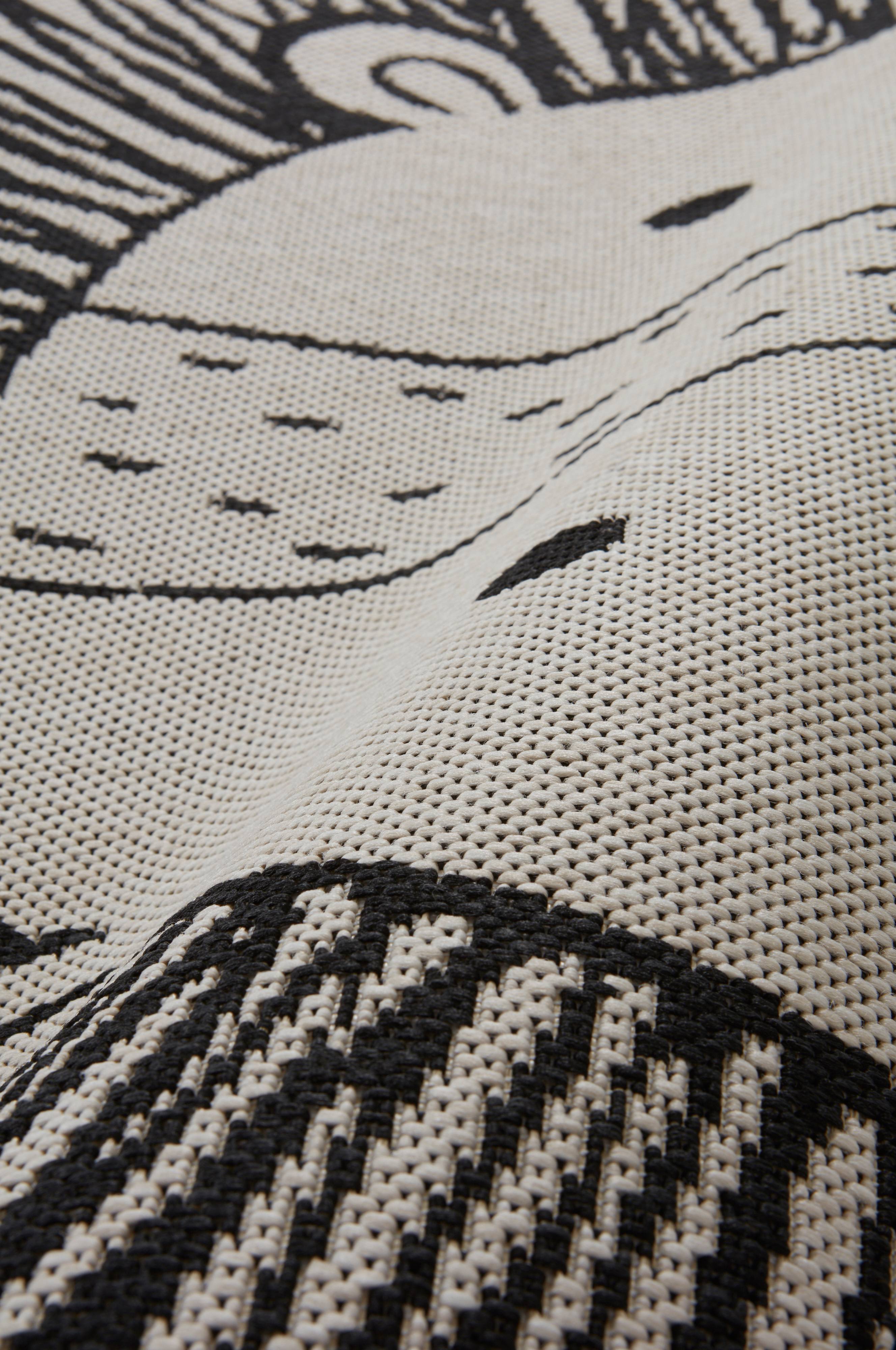 Rundt, glattvevd teppe av polypropylen og polyester. Dette er et robust teppe som passer like fint innendørs som utendørs. Det tåler vann, og er UV-resistent. Et perfekt teppe til barnerommet, dukkehuset eller på terrassen. Tykkelse 0,5 cm. 1050 g/m².