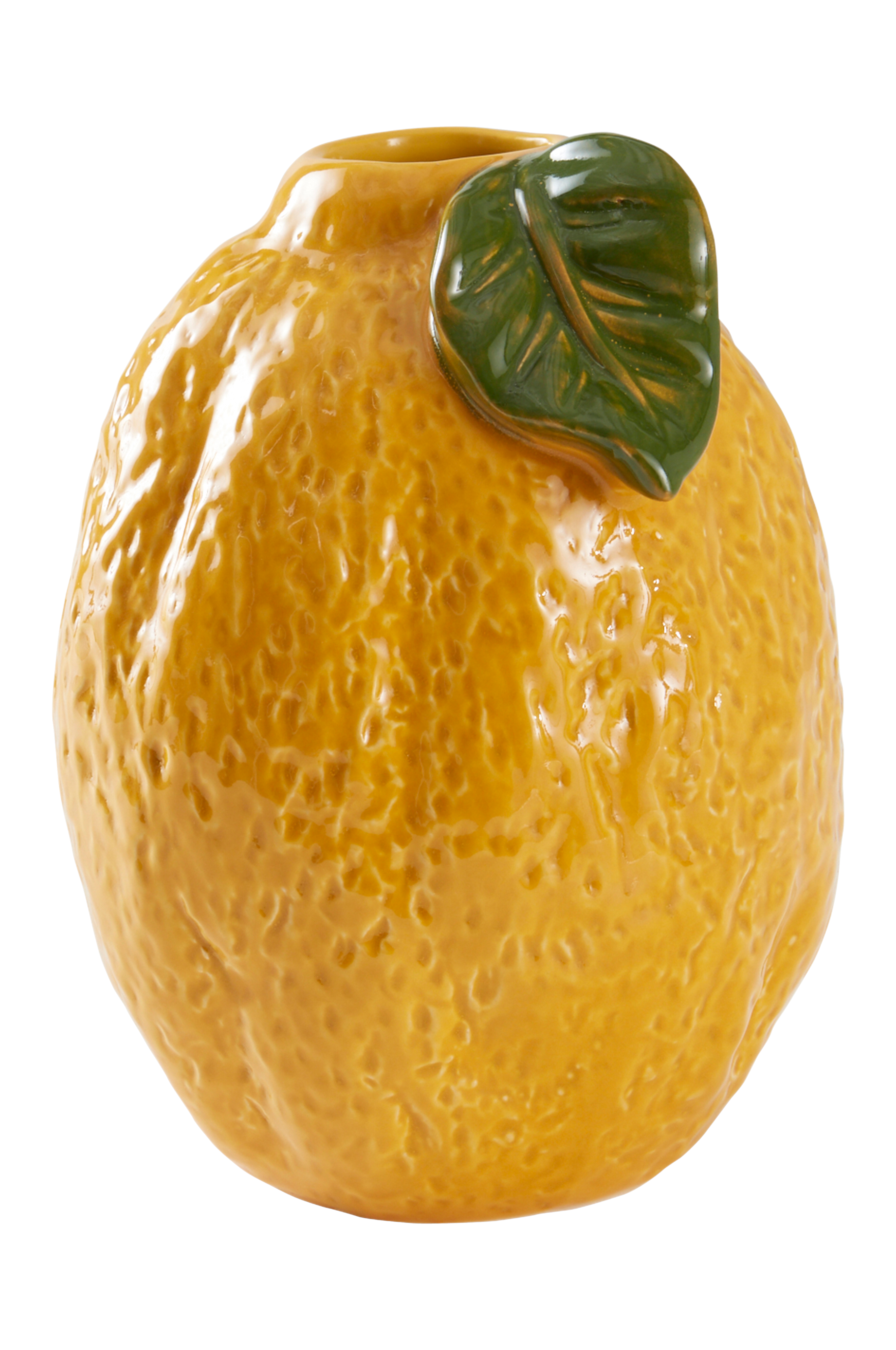 LIMONE er en håndlaget, fargerik vase, inspirert av sitrusfrukter og dekorert med et grønt blad. Vasen har fin tekstur og er glasert i gult med grønne detaljer, også innsiden er glasert. Det fine håndverket gjør hver vase unik. Husk at keramikk kan slippe gjennom fukt.
