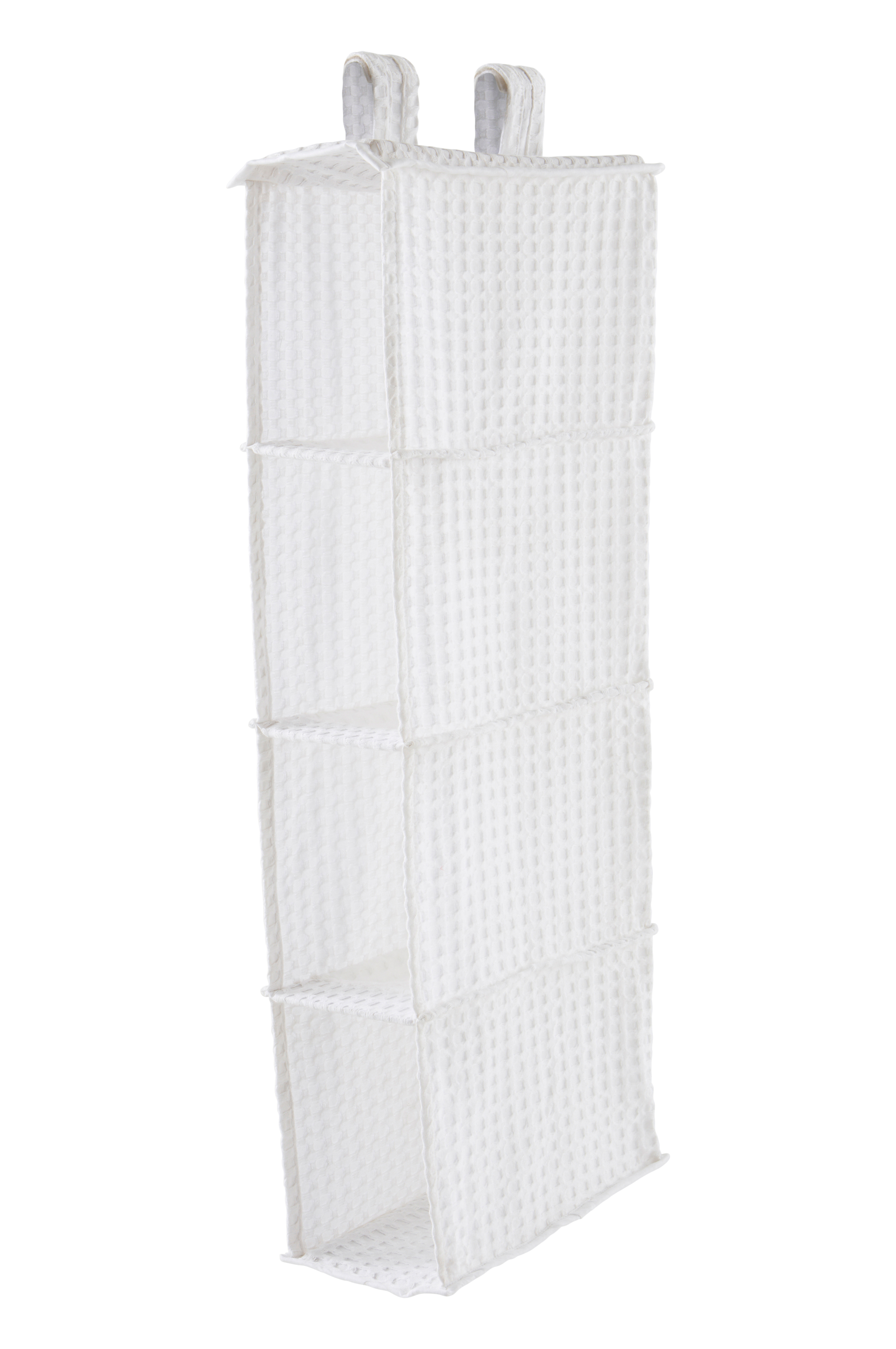 Garderobeoppbevaring av bomull med fire rom til for eksempel sko. Stoffet har vevd vaffeltekstur. Øverst har oppbevaringen to hemper med borrelås slik at du enkelt kan henge den rundt klesstangen, en kleshenger eller en rundstav. De fire rommene er forsterket med kartong for å gjøre de ekstra stabile. Garderobeoppbevaringen er også perfekt i gangen, på barnerommet og overalt der du trenger litt ekstra oppbevaring.