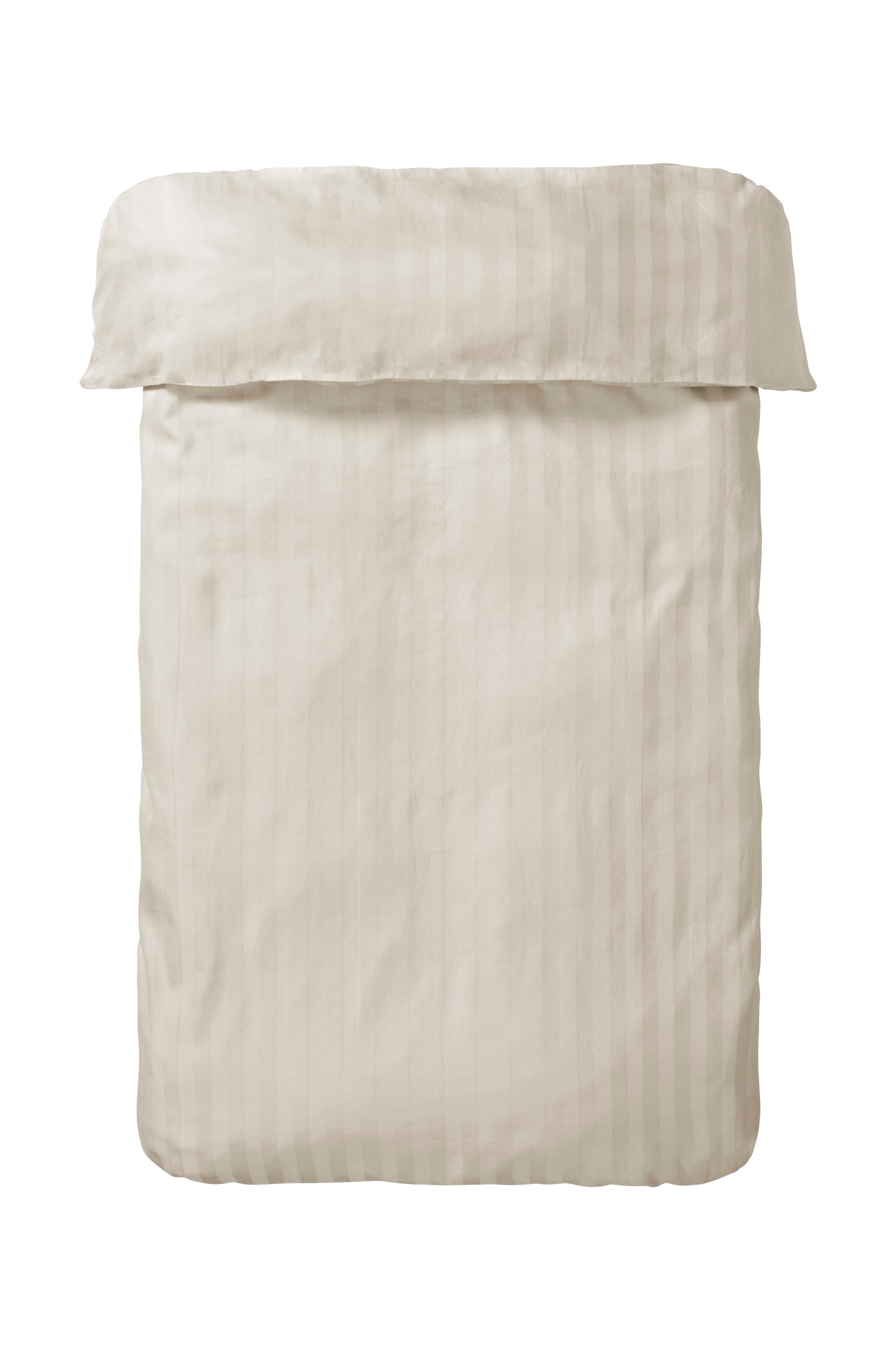 Ensfarget dynetrekk i sateng av bomull med vevde striper ton-i-ton. Sateng er en veveteknikk som gir et herlig glatt og mykt stoff. Bomull som veves med denne teknikken blir til et stoff med fin glans og luksuriøs følelse. Trådtetthet på 215 tc. (Trådtettheten forteller om antallet tråder, thread counts, pr. kvadrattomme i et stoff. Jo høyere trådtetthet, desto høyere kvalitet). Åpning øverst i hjørnene på dynetrekket.