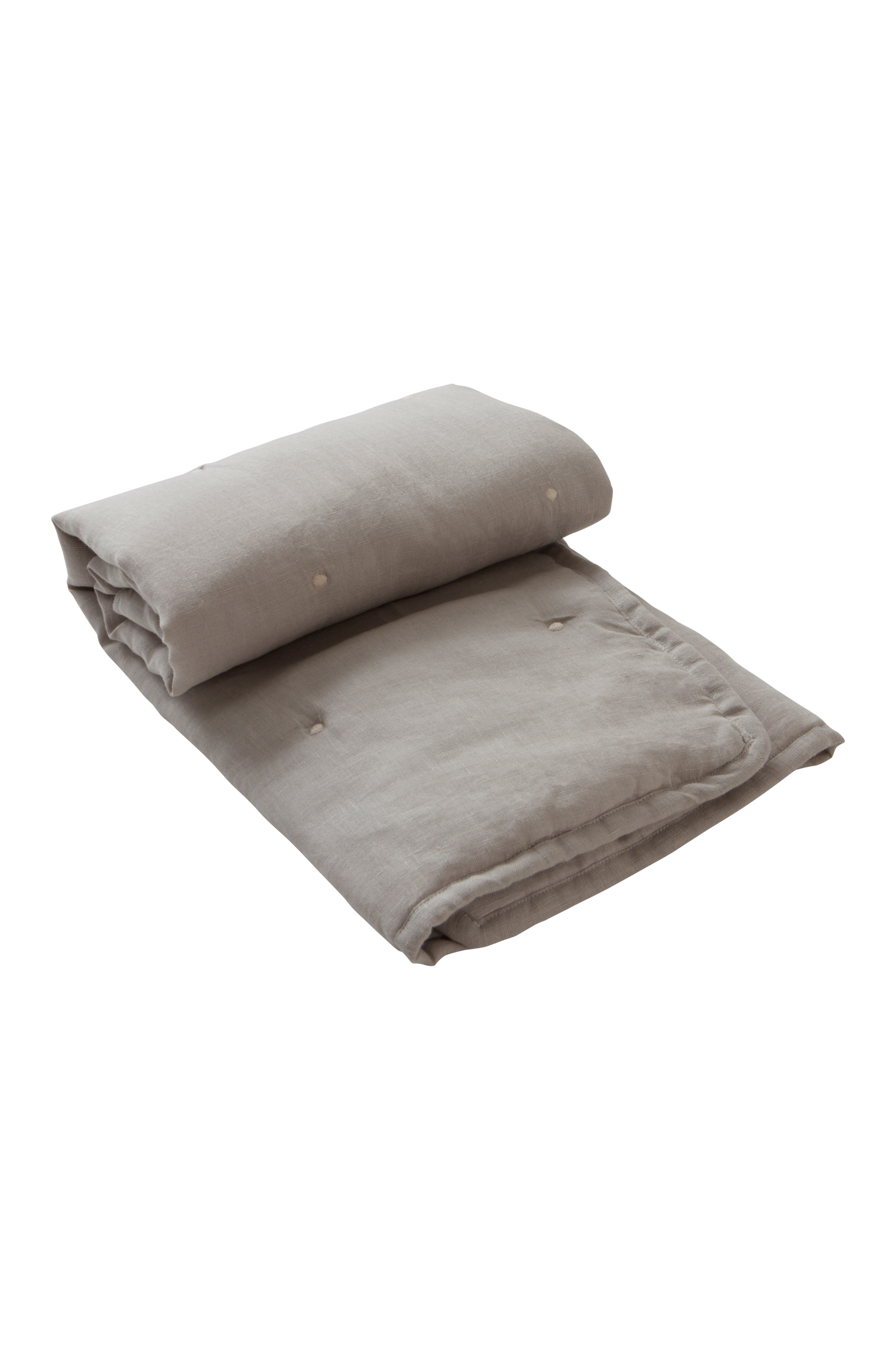 Babyteppe av naturlig og komfortabel lin med fyll av polyester. Den deilige linkvaliteten er vasket for å bli herlig myk og deilig. Teppet har brodert prikkmønster og en sydd kant rundt. Fyllet gjør teppet varmt og behagelig. Teppet er deilig å svøpe rundt barnet når det ligger på fanget, til sprinkelsengen eller på gulvet for å ligge litt på magen og trene nakken. Vekt 160 g/m².