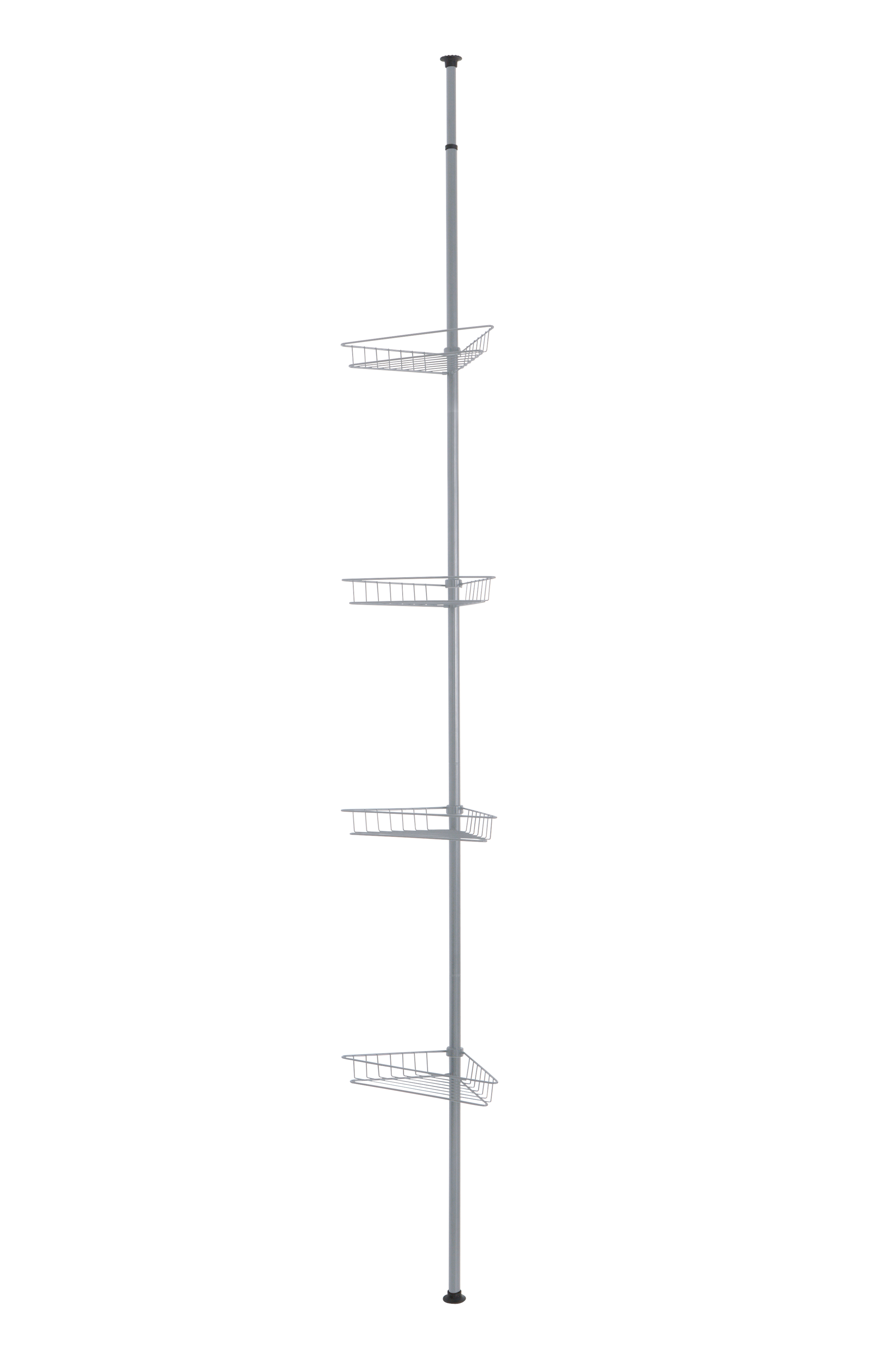 Praktisk hjørnehylle til badet. Hyllen kan plasseres mellom badekarets kant og taket, eller fra gulv til tak. Teleskopstang gir justerbar høyde og gjør den enkel å feste. Fleksibel etter dine ønsker med fire flyttbare hyller. Det er viktig å følge den medfølgende monteringsanvisningen når du monterer hyllen for å sikre stabilitet.
