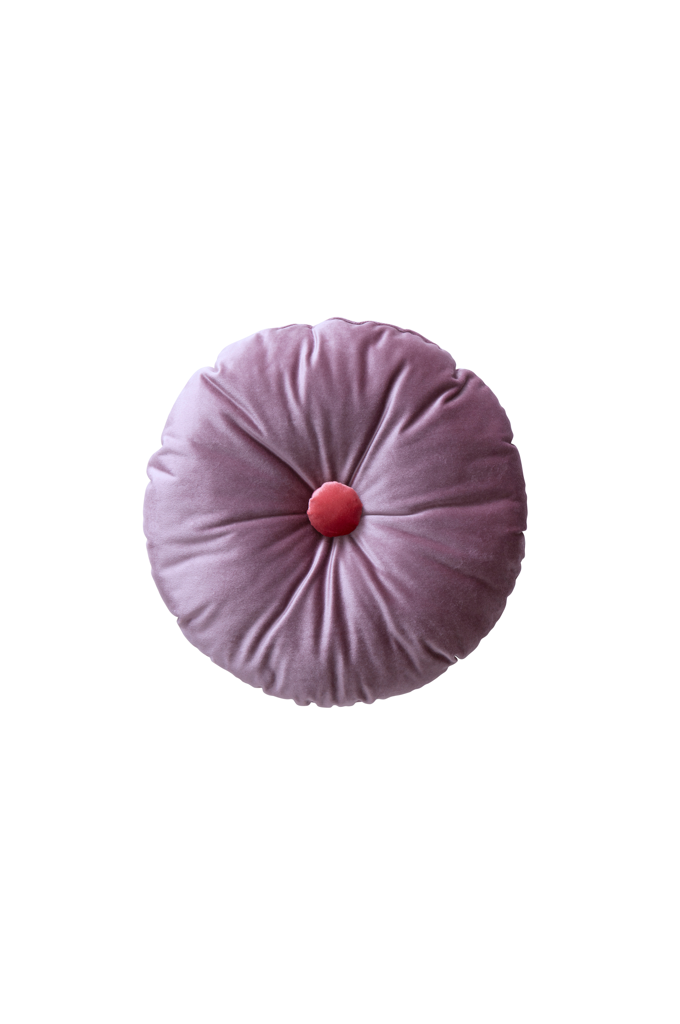 1-pk rund pute av fløyel med stor fløyelskledd knapp i midten på begge sider. Puten er mykt stoppet og i lekne farger som er morsomme å matche med hverandre.