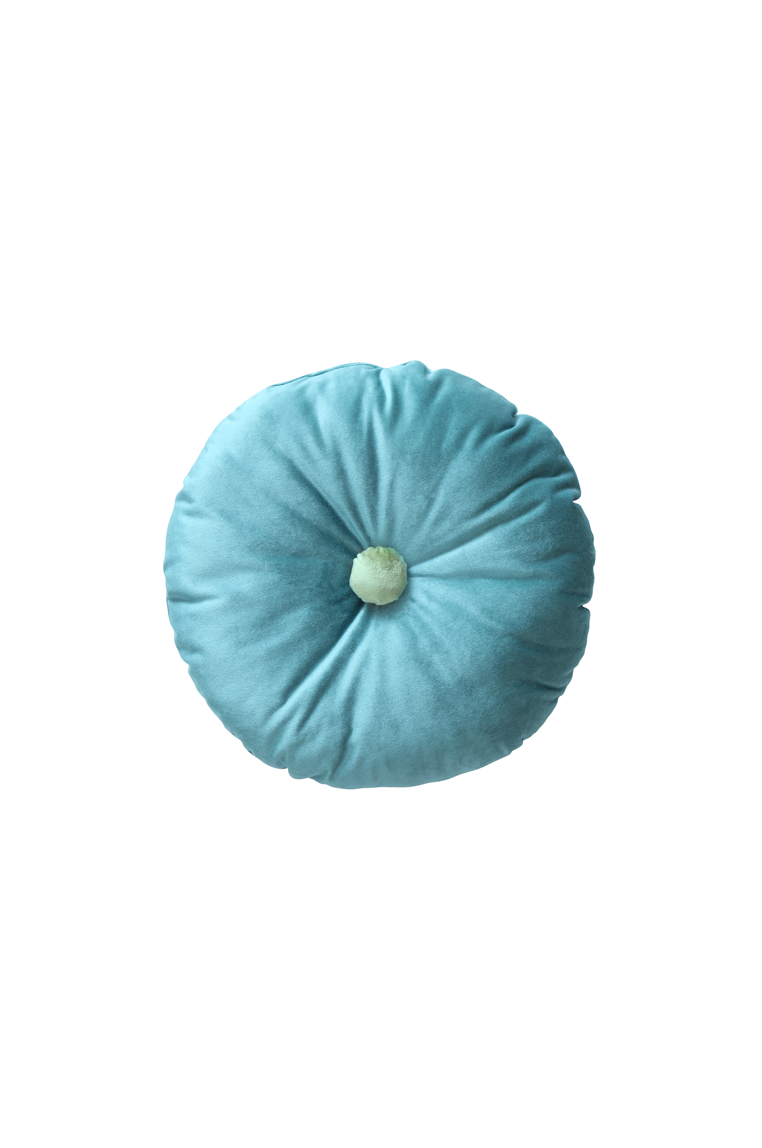 1-pk rund pute av fløyel med stor fløyelskledd knapp i midten på begge sider. Puten er mykt stoppet og i lekne farger som er morsomme å matche med hverandre.