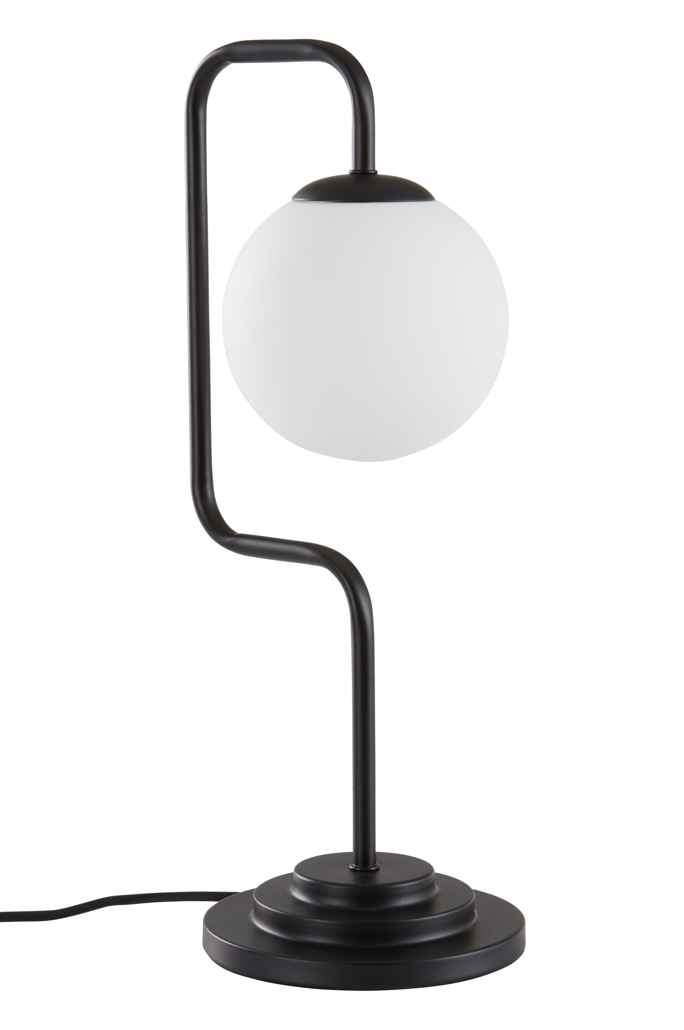 Bordlampe av metall med rund kuppel av opalglass. Den pent formede foten gir lampen herlig karakter, og den er en fin blanding av moderne og gammeldags. Lampen er pen både i vinduskarmen, på skrivebordet eller på et skap. Strømbryteren er plassert på ledningen.