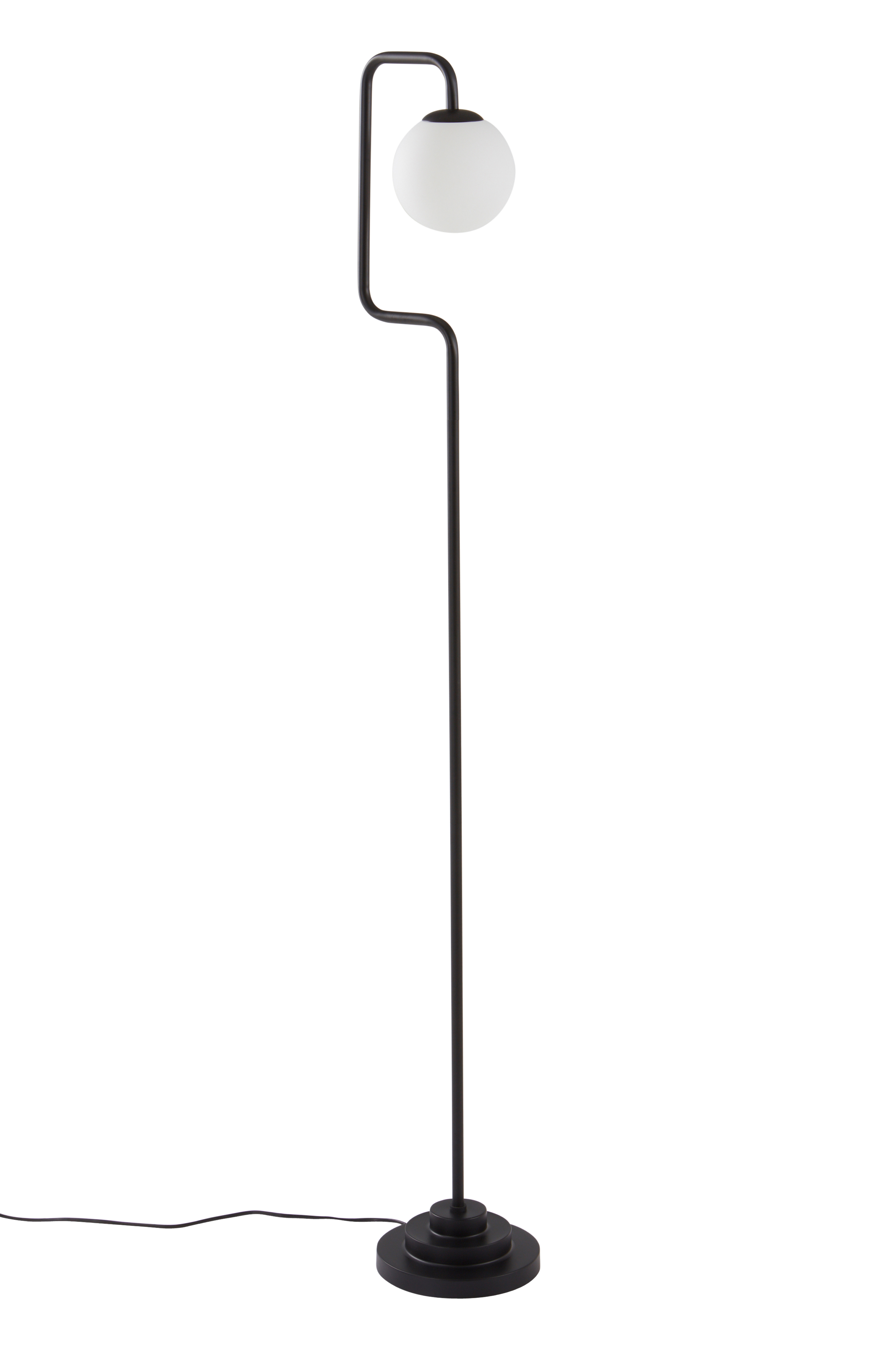 Gulvlampe av metall med rund kuppel av opalglass. Den pent formede foten gir lampen herlig karakter, og den er en fin blanding av moderne og gammeldags. Lampen er praktisk siden den tar liten plass. Samtidig gir den fint lys der du vil lyse opp. Ledningen er transparent og har gulvstrømbryter på ledningen.